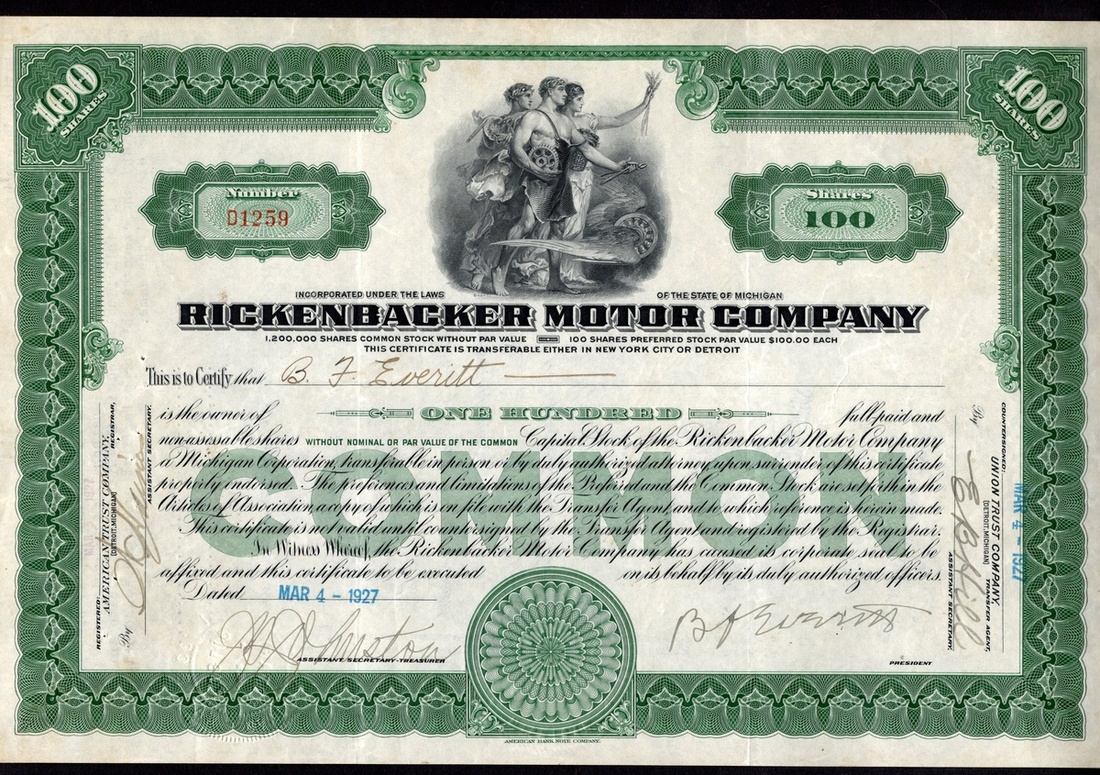 Rickenbacker Motor Company (MI). Certificate for 100 Shares, March 4, 1927. No. D1259. Issued to and signed by B.F. Everett as president. Allegorical scene of Industry, Knowledge and Science, green. The company was established by Barney Everett and WWI fighter ace Eddie Rickenbacker as vice president in 1921. Rickenbacker resigned in 1926 because of internal discord, and the company filed for bankruptcy in 1927. Allegorical scene of Industry, Knowledge and Science, green. ABNC. Very Fine.