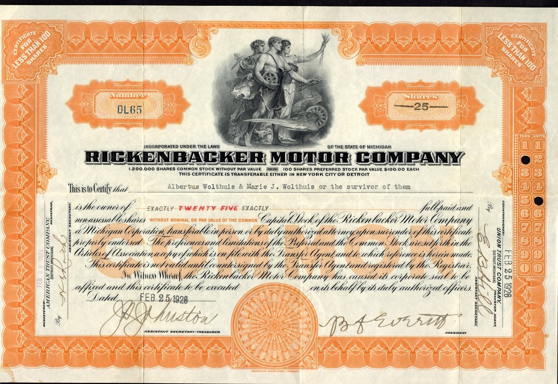 Rickenbacker Motor Company (MI). Certificate for 25 Shares, March 4, 1927. No. DL65. Signed by B.F. Everett as president. Allegorical scene of Industry, Knowledge and Science, green. The company was established by Barney Everett and WWI fighter ace Eddie Rickenbacker as vice president in 1921. Rickenbacker resigned in 1926 because of internal discord, and the company filed for bankruptcy in 1927. Allegorical scene of Industry, Knowledge and Science, orange. ABNC. Two punch cancel. Very Fine. Ex R.M. Smythe Auction, NY, Feb. 6-7, 2008, lot 1019.