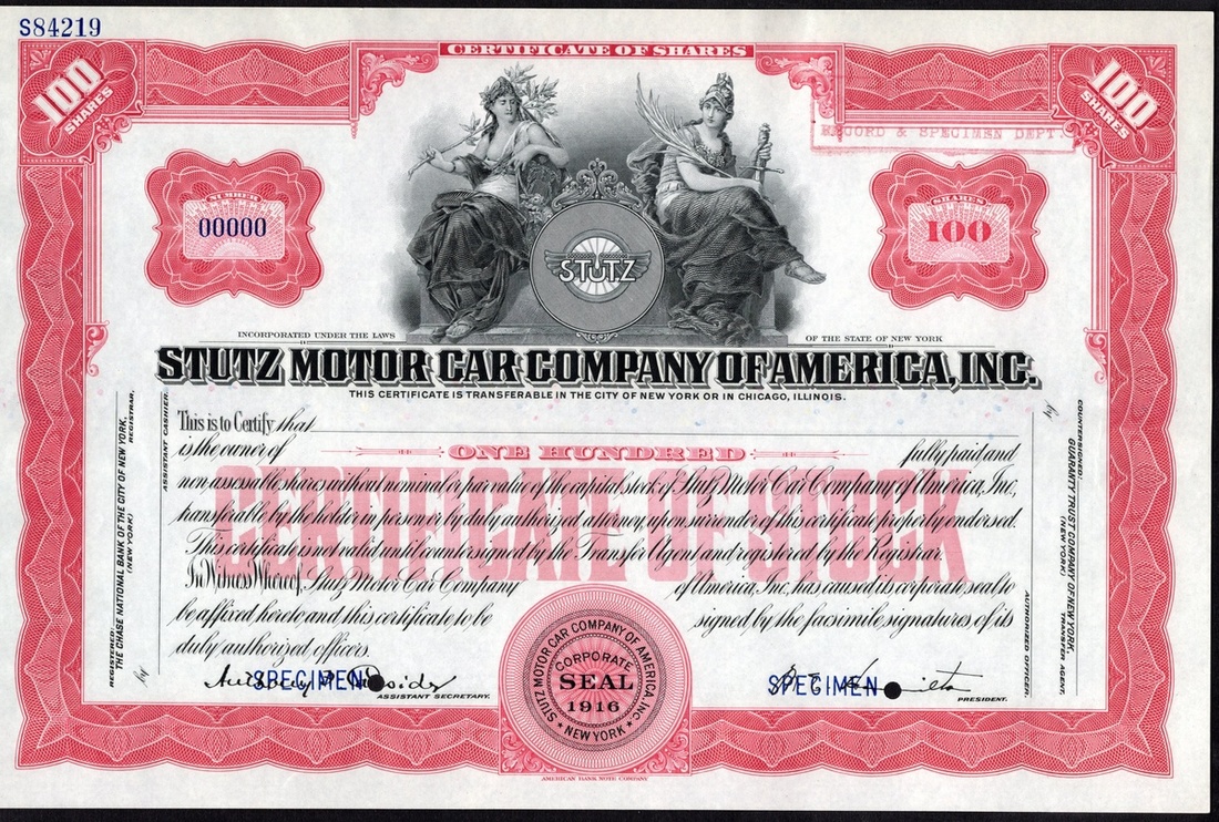Stutz Motor Car Company of America (IL). Specimen Certificate, ca. 1916. No. 00000/ S84219. Allegorical women flank company logo, carmine borders. ABNC. EF-AU.