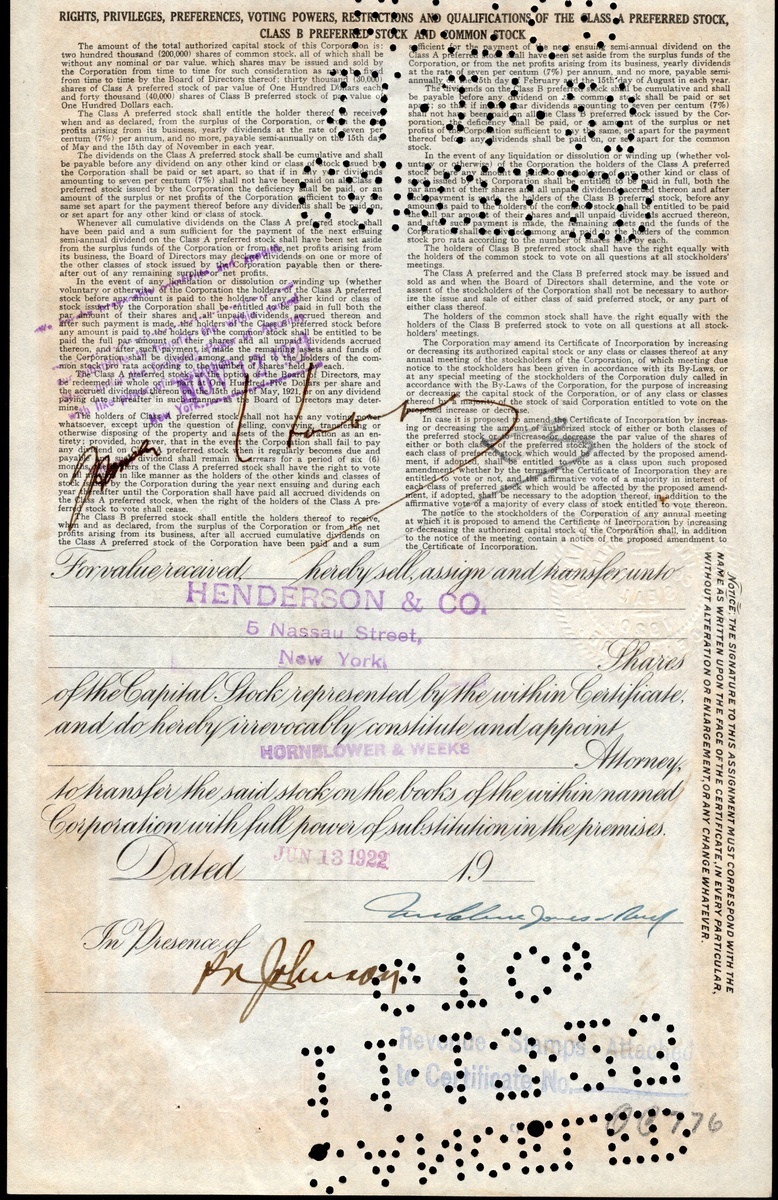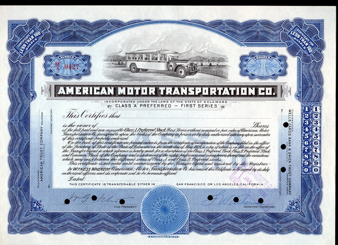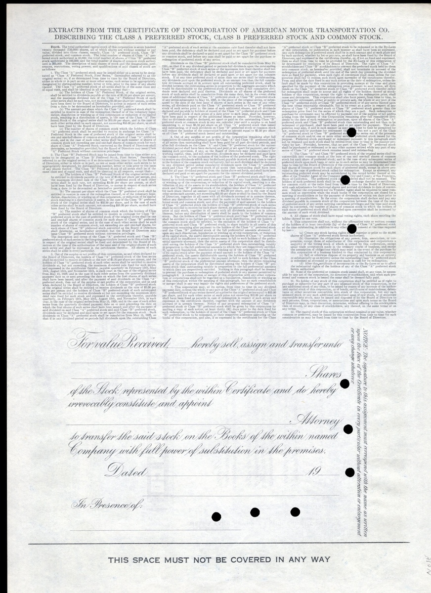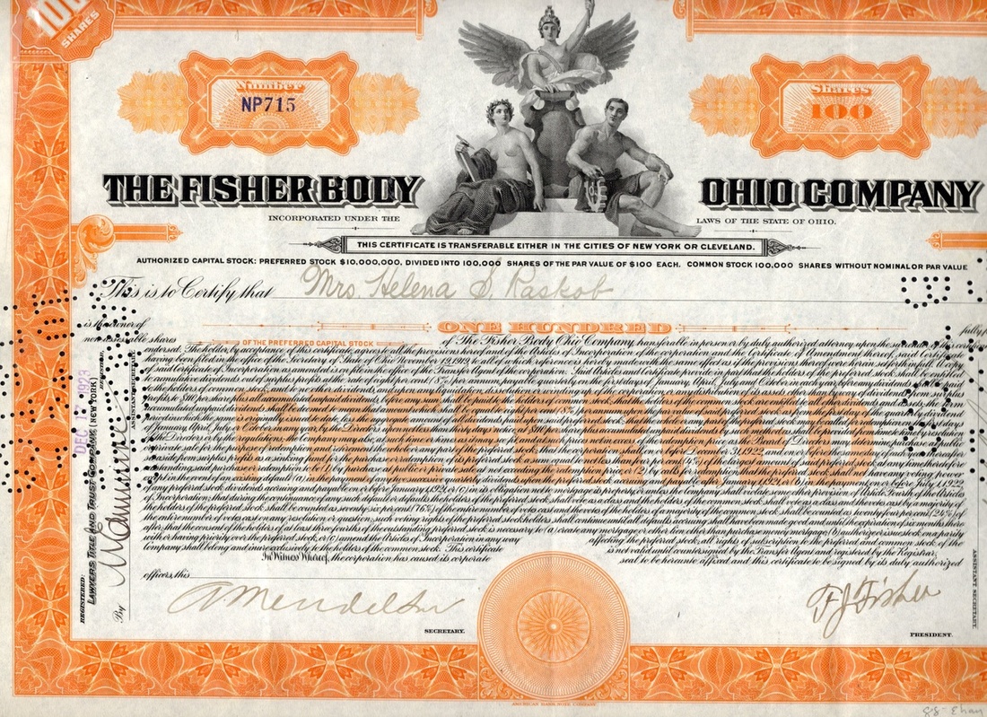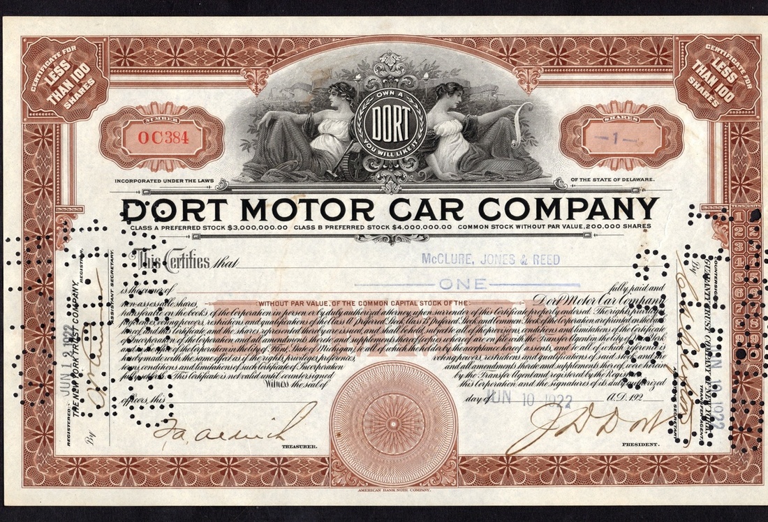 Trio of Automobile-related Certificates. Fisher Body Ohio Co.. 100 Shares Preferred Stock, 1923. No. NP715. Orange borders. Pin cancelled; American Motor Transportation Co. Unissued. No. SF/A 0427. Old-time tour bus vignette, blue borders Cancelled 1930; and Dort Motor Car Co. One Share, June 10, 1922. No. OC384. Two reclining allegorical women flank DORT logo. Pin cancelled. VF-EF. [3]