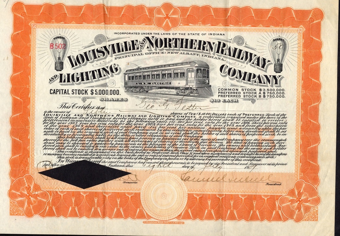 Louisville and Northern Railway and Lighting Co. Certificate for 50 Shares at $10, 8 July 1909. No. B 502. Signed by Samuel Insull as president. Insull began as Thomas Edison's personal secretary, advanced to Vice President of Edison General Electric Co., then went to Chicago as head of the Chicago electric franchise, where he eventually became president of the Commonwealth Edison. He built a financial empire, forging a near monopoly of the city's electric business. It all collapsed with the 1929 Wall Street Crash. He fled to Europe in 1932 to escape prosecution but was extradited and tried for fraud and embezzlement three times, being acquitted each time, but losing his vast wealth in the process. Electric trolley car at center, radiant light bulbs far left and right, orange-red borders. Diamond cut cancel. Very Fine.