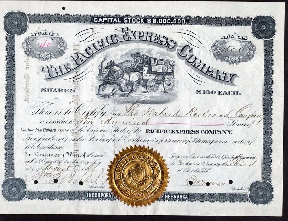 Pacific Express Company (NE). Certificate for 500 Shares at $100 each, 3 August 1894. No. 40. Pacific Express wagon reaching Omaha station a horse's head ahead of the railroad train, fancy black border, gold embossed seal. Issued to the Wabash Railway Company. Punch cancelled. Extremely Fine. Ex R.M. Smythe Auction, NY, Feb. 6-7, 2008, lot 1134.
