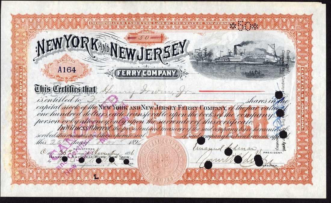 New York and New Jersey Ferry Company. Certificate for 5 Shares at $100 each, 25 November 1896. No. A164. Signed by Lehman Brothers co-founder, Emanuel Lehman as president. Red frame, river scene with various ships upper right. Punch and ink stamp cancelled. Extremely Fine.