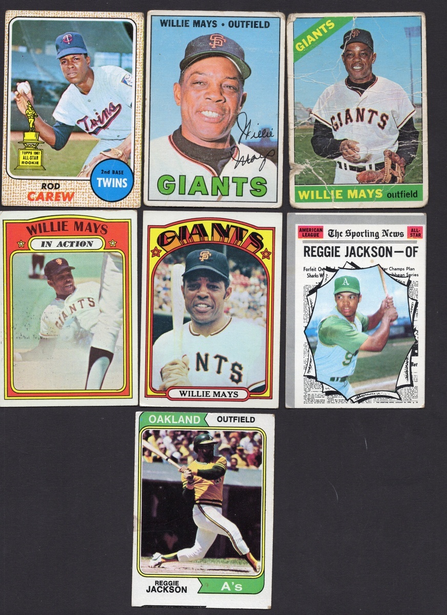 Large Lot of 1966 to 1974 Topps Baseball Cards. Includes: Willie Mays #1 1966 Topps Poor, #200 1967 Topps VG: Rod Carew #80 1968 Topps VG; Ernie Banks #20, Lou Brock #85 -1969 Topps; Reggie Jackson #459 1970 Topps VG-Excellent; Dave Concepcion #14, Willie McCovey #50 1971 Topps VG-Excellent; Willie Mays #49, 50 , Rookies Stars #79 Excellent 1972 Topps; Lou Brock #320, Jonny Bench #380 Excellent 1973 Topps; Reggie Jackson #130 1974 Tops VG-Excellent; Roberto Clemente 12, Willie Mays #18, Henry Aaron #24, and Reggie Jackson #28 VG to Excellent 1970 Topps Super; various others, no duplication. Poor to Excellent [159]