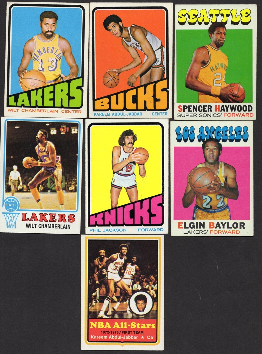 1971-1973 Topps Basketball Cards Lot. Includes: Elgin Baylor #10, Spencer Haywood #20, Dave Cowens #47 Excellent - 1971 Topps; Wilt Chamberlain #1, Pete Maravich #5, Phil Jackson #32, Jerry West #75, Kareem Abdul-Jabbar #100 Excellent- 1972 Topps; Kareem Abdul-Jabbar #50, Wilt Chamberlain #80, Pete Maravich #130, Bob McAdoo #135, Julius Erving #240 the last VG, the others Excellent - 1973 Topps, and various others, no duplication. Very Good to Excellent. [92]