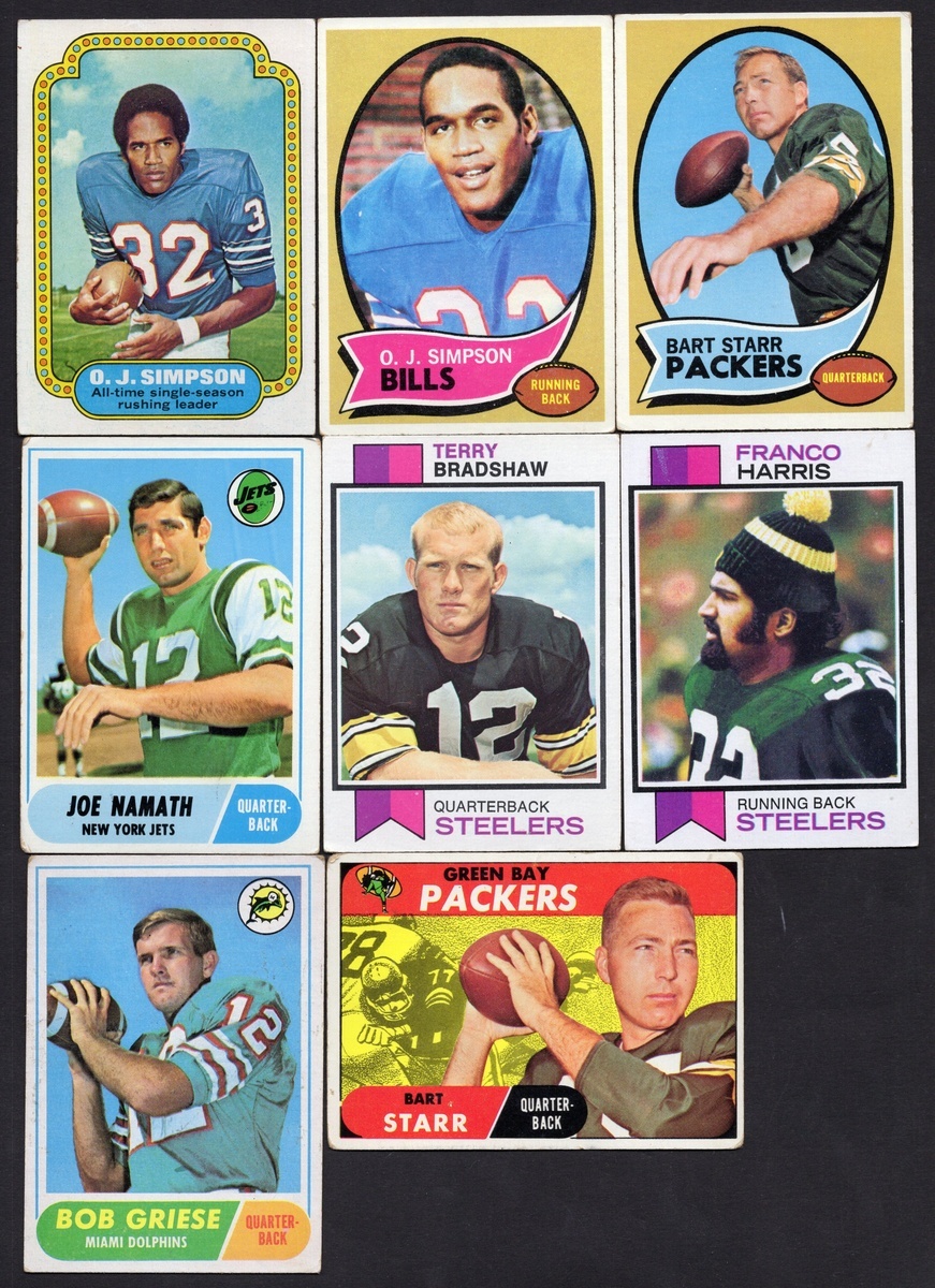 1967-1974 Topps Football Cards Lot (178). Includes: Bart Starr #1, Joe Namath #65, Gale Sayers #75, Bob Griese #196 Excellent 1968 Topps; Bart Starr #30, Alan Page #59, Gale Sayers #70, O.J. Simpson #90 Excellent 1970 Topps; Johnny Unitas #1, Bart Starr # 200 VG and Excellent 1971 Topps; Terry Bradshaw #15, Ken Anderson #34 and Franco Harris #89 Excellent 1973 Topps; O.J. Simpson #1 Excellent 1974 Topps, and various other, no duplication; also 1970-1971 Topps Hockey Cards (7), including Bobby Orr #3 Excellent 1970 Topps. [185]