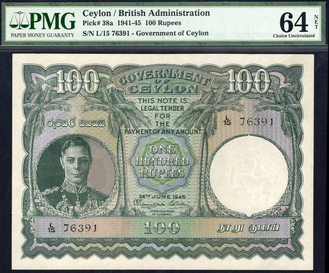 Ceylon. British Administration. Government of Ceylon. 100 Rupees. 24th June 1945. P-38a. No. L/15 76391. Green on violet, yellow-brown and red. George VI at left, palm trees flank center; Laxapana Falls on back. PMG Choice Uncirculated 64 Net, minor rust (not visible).