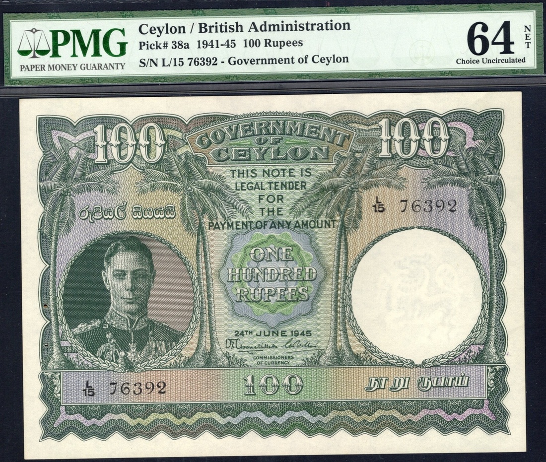 Ceylon. British Administration. Government of Ceylon. 100 Rupees. 24th June 1945. P-38a. No. L/15 76392. Green on violet, yellow-brown and red. George VI at left, palm trees flank center; Laxapana Falls on back. PMG Choice Uncirculated 64 Net, minor rust (not visible).