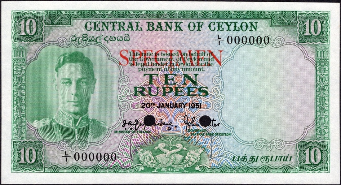 Ceylon. British Administration. Central Bank of Ceylon. Color Trial Specimen 10 Rupees. 20th January 1951. P-48cts. No. L/I 000000. Green and violet on multicolor. George VI at left; medieval statuary center back. Crisp Uncirculated.