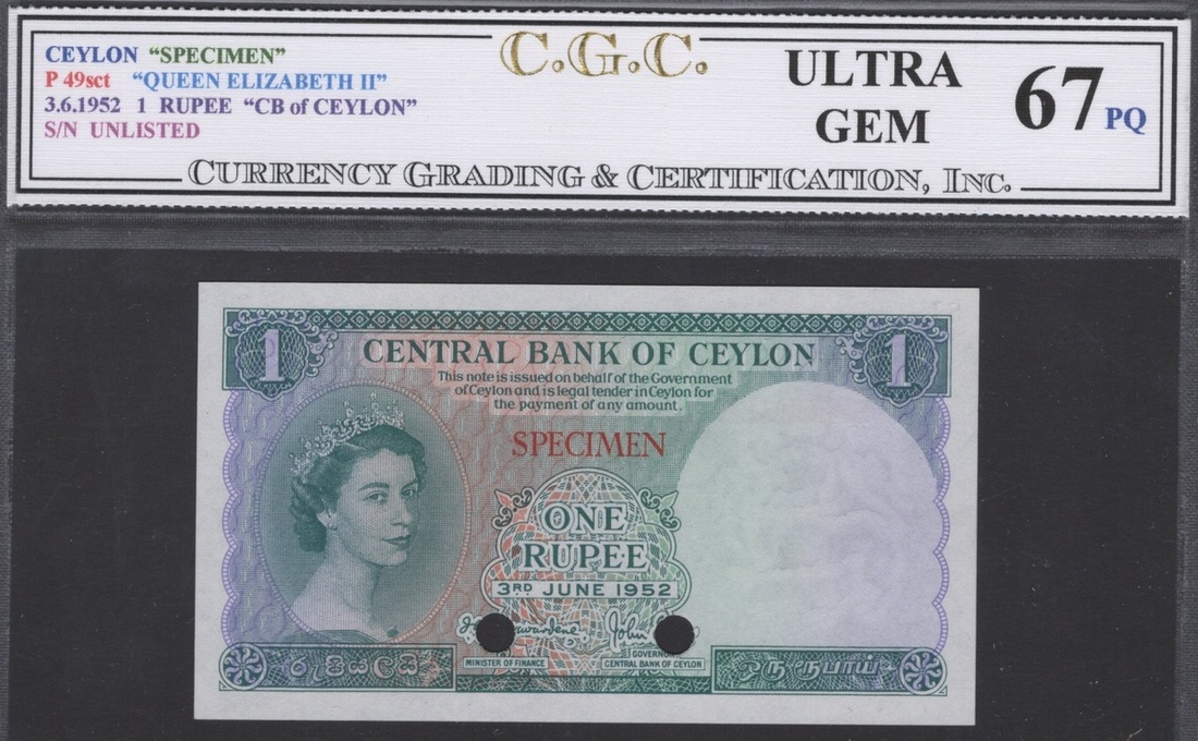 Ceylon. British Administration. Central Bank of Ceylon. Color Trial Specimen 1 Rupee. 3rd June 1952. P-49cts. No. 81. Dark green, violet and orange. Elizabeth II at left; medieval stairway back right. Horizontal red SPECIMEN front and back, two punches. CGC Ultra Gem 67 PQ, "Rare - Only 1 graded".