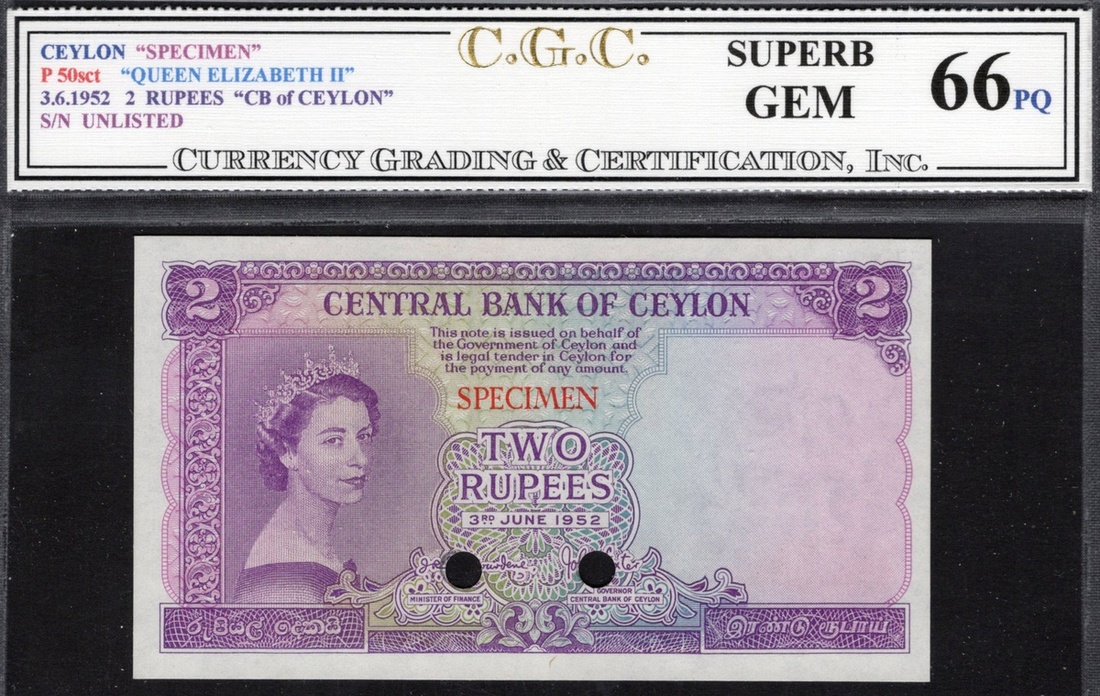 Ceylon. British Administration. Central Bank of Ceylon. Color Trial Specimen 2 Rupees. 3rd June 1952. P-50cts. No. 31. Purple and light blue. Elizabeth II at left; ancient pavilion on back. Horizontal red SPECIMEN front and back, two punches. CGC Superb Gem 66 PQ, "Rare - Only 1 graded".