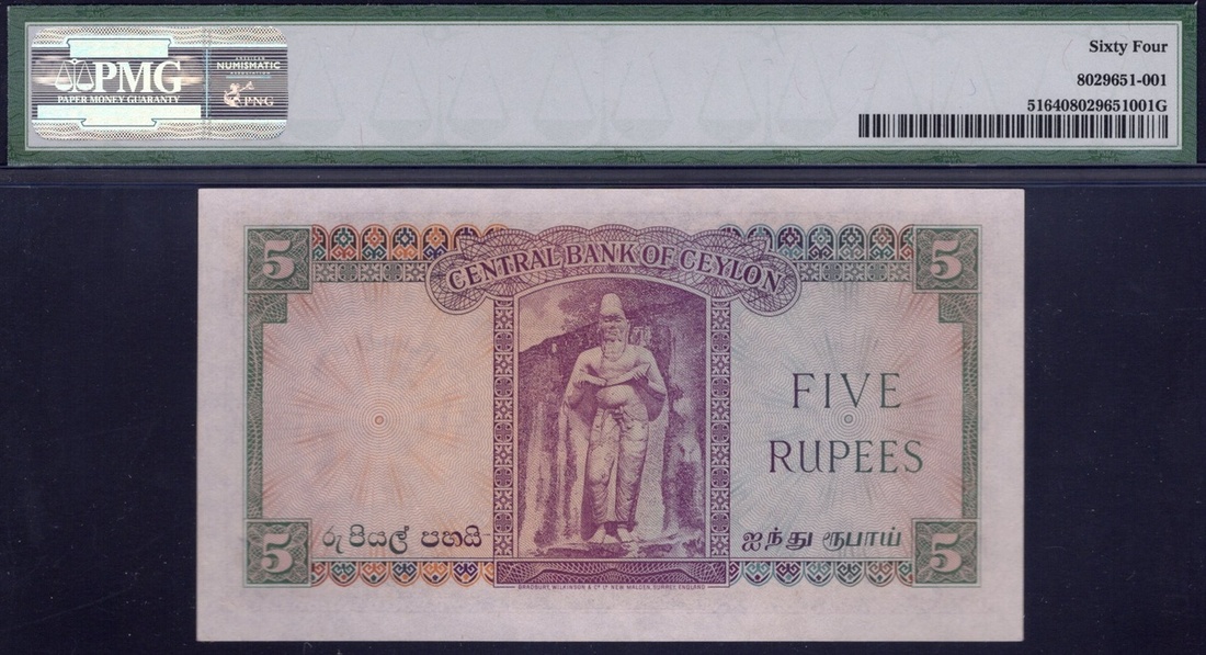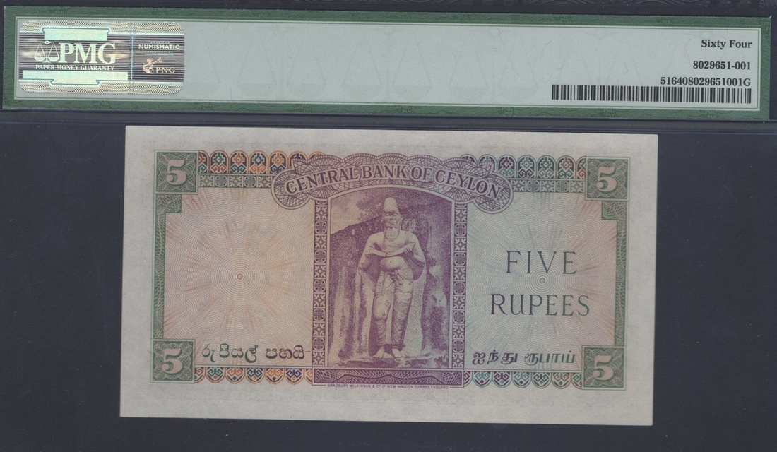 Ceylon. British Administration. 5 Rupees. 3rd June 1952. P-51. No. G/7 924301. Purple on blue, green and orange. Elizabeth II at left; Statue of King Parakramabahu I back center. PMG Choice Uncirculated 64.