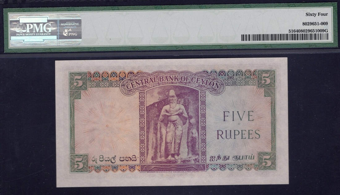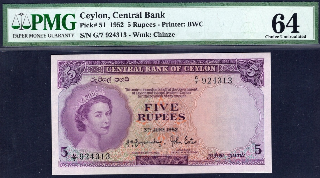 Ceylon. British Administration. 5 Rupees. 3rd June 1952. P-51. No. G/7 924313. Purple on blue, green and orange. Elizabeth II at left; Statue of King Parakramabahu I back center. PMG Choice Uncirculated 64.