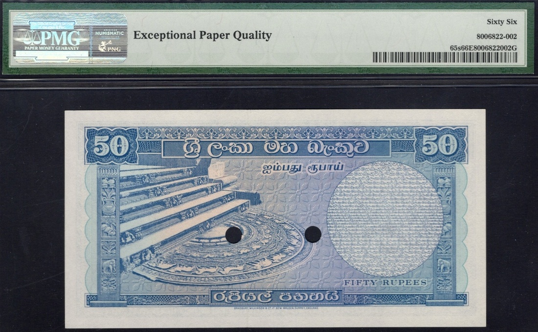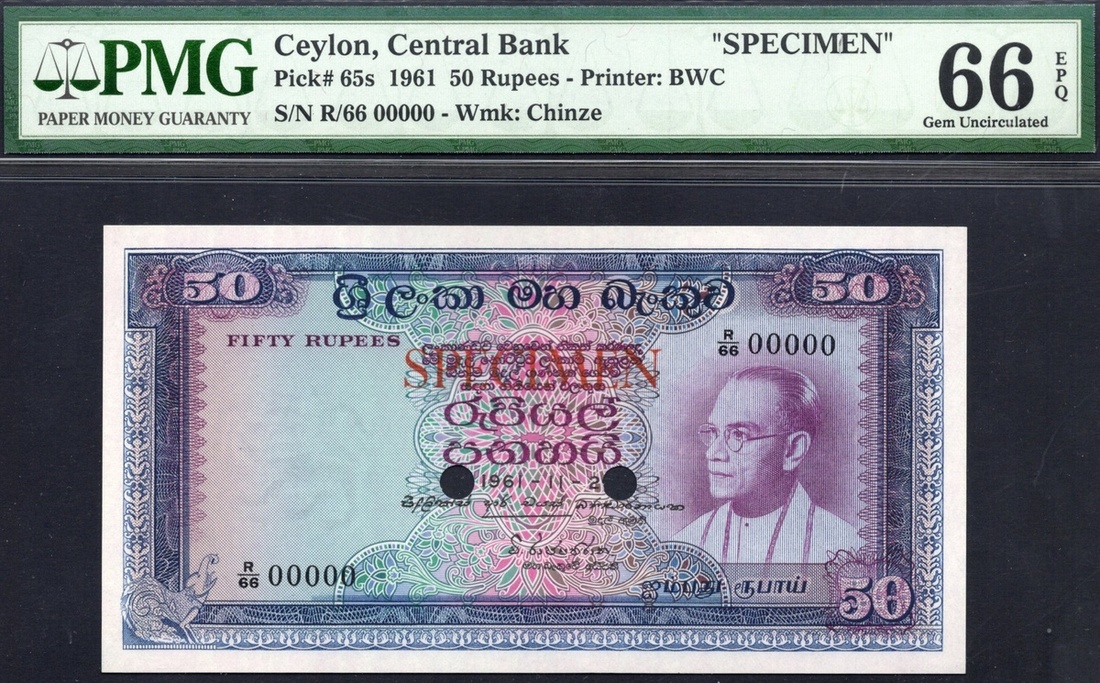 Ceylon. State. Central Bank of Ceylon. Specimen 50 Rupees. 2nd November 1961. P-65s. No. R/66 00000. Blue and purple on multicolor. President S.W.R.D. Bandaranaike at right; Ornate staircase back left. Horizontal red SPECIMEN on front, two punches PMG Gem Uncirculated 66 EPQ.