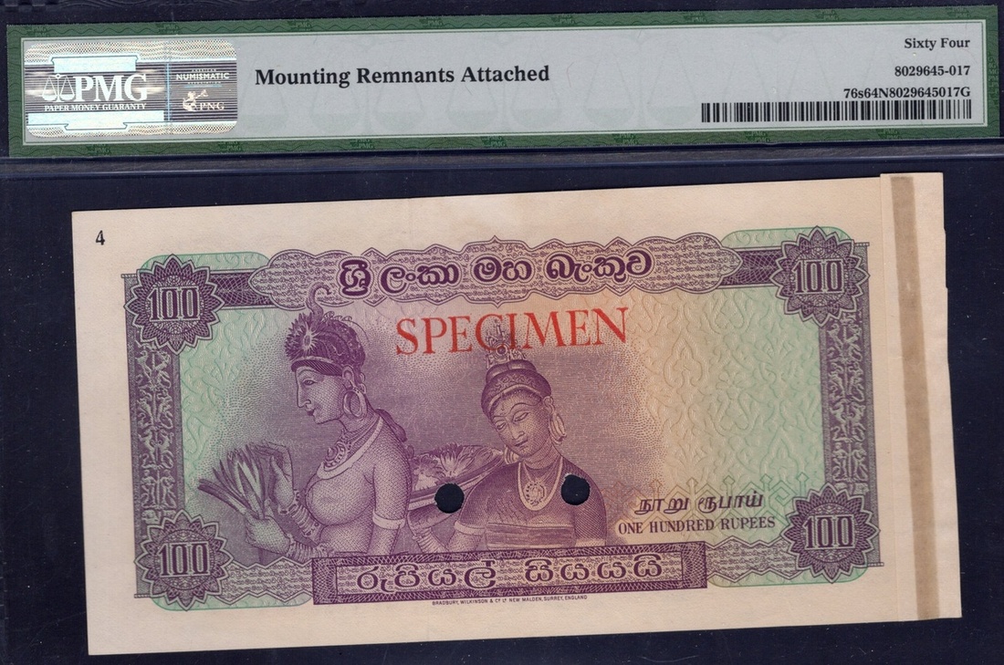 Ceylon. State. Central Bank of Ceylon. Color Trial Specimen 100 Rupees. ND (1969). P-76cts. No. 4. Purple on multicolor. Statue of King Parakramabahu I at right; two medieval era women on back. Diagonal red SPECIMEN front, horizontal on back, two punches. PMG Choice Uncirculated 64 Net, mounting remnants attached (noted as Specimen only on holder).