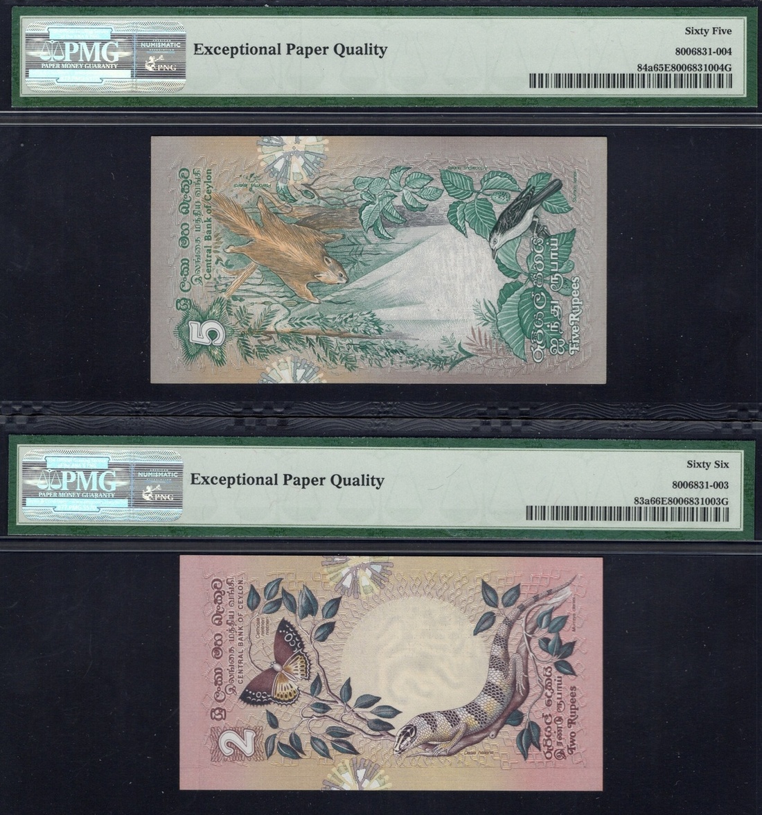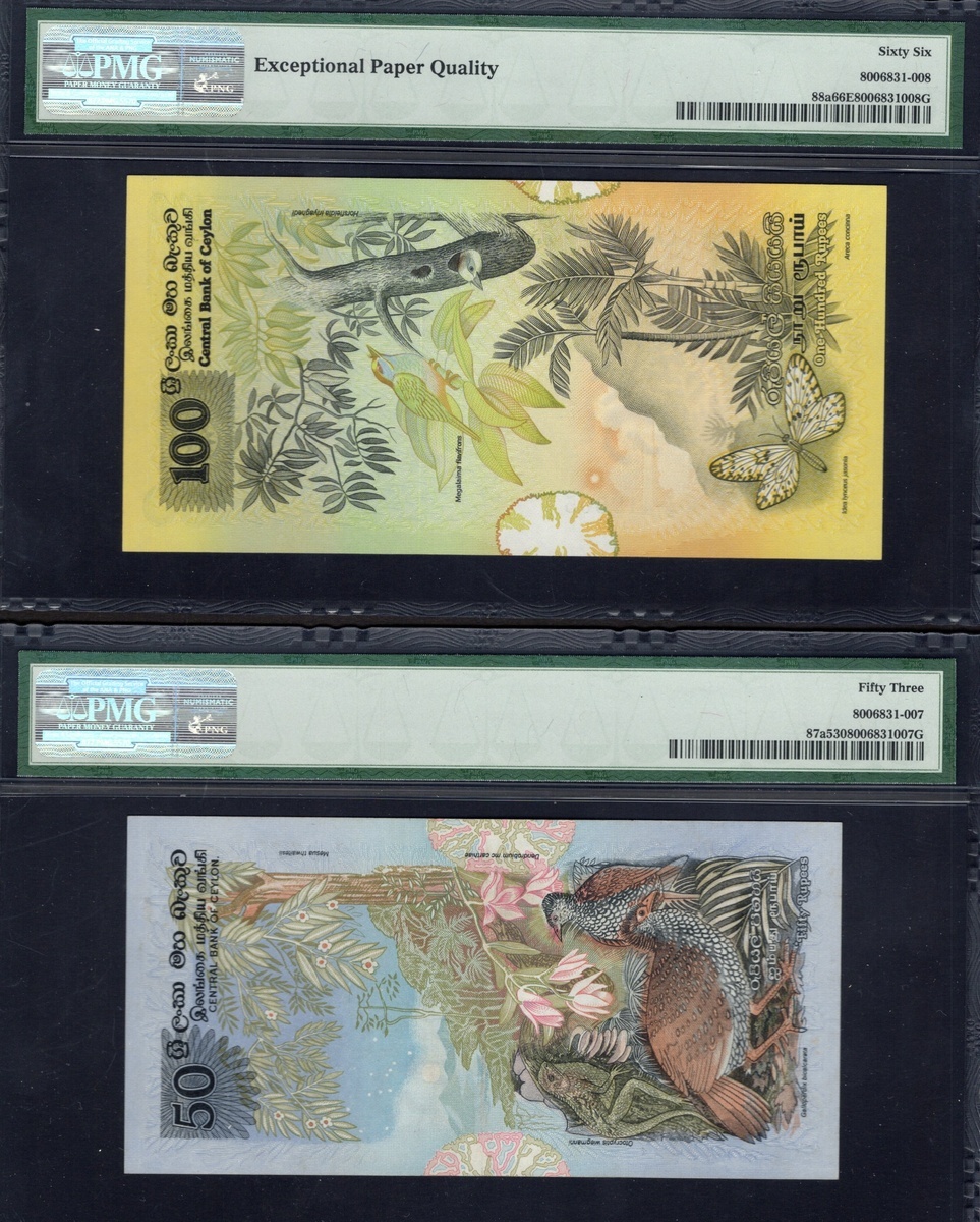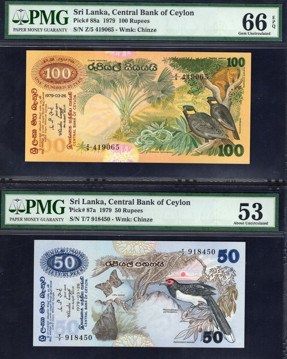 Sri Lanka. Central Bank of Sri Lanka. PMG-graded 1979 Issue type Set. 2, 5, 10, 20, 50 and 100 Rupees. P-83a to 88a. Fauna motifs. The first, third and last Gem Uncirculated 66 EPQ; the second Gem Uncirculated 65 EPQ; the fourth Choice Uncirculated 64 EPW and the fifth About Uncirculated 53. [6]