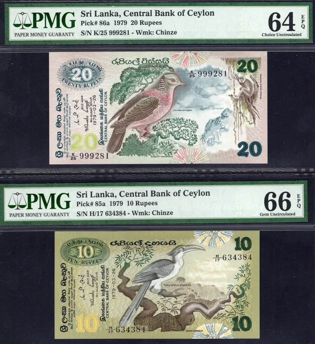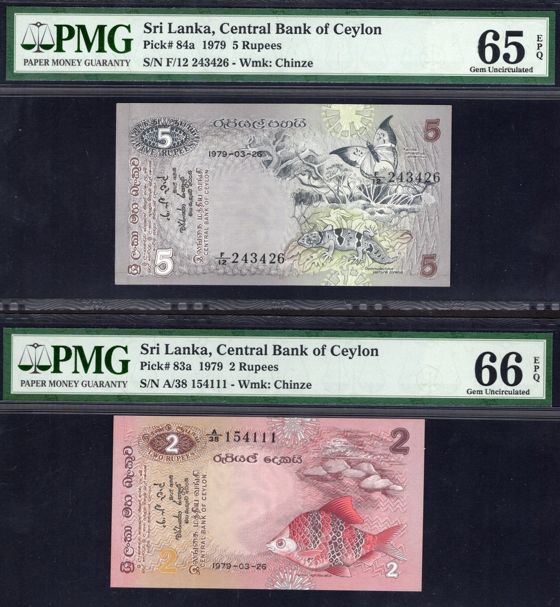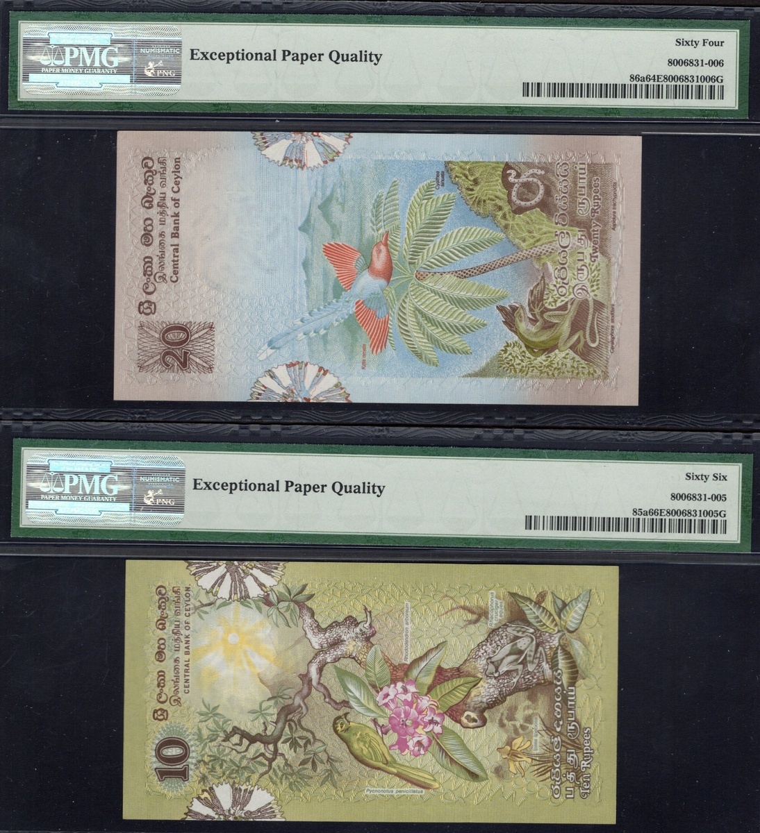 Sri Lanka. Central Bank of Sri Lanka. PMG-graded 1979 Issue type Set. 2, 5, 10, 20, 50 and 100 Rupees. P-83a to 88a. Fauna motifs. The first, third and last Gem Uncirculated 66 EPQ; the second Gem Uncirculated 65 EPQ; the fourth Choice Uncirculated 64 EPW and the fifth About Uncirculated 53. [6]