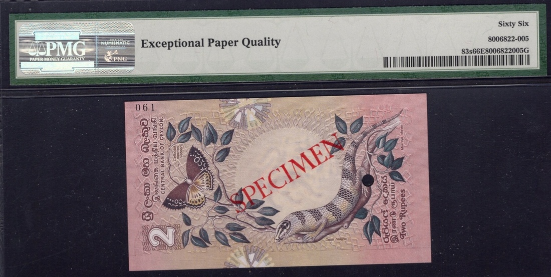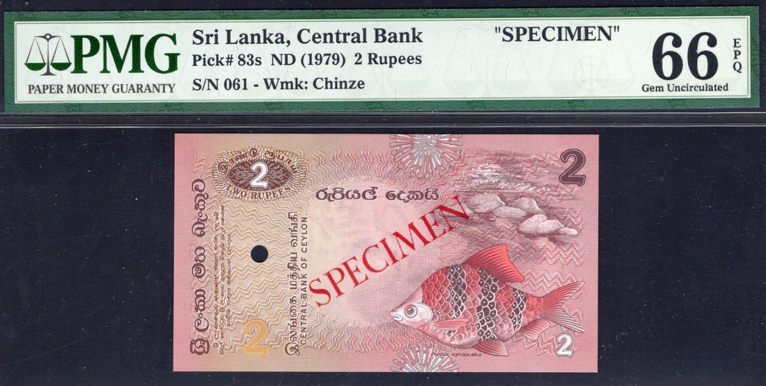 Sri Lanka. Central Bank of Ceylon. Specimen 2 Rupees. ND (1979). P-83s. No. 061. Red on multicolor. Fish at right; Butterfly and lizard on vertical format back. PMG Gem Uncirculated EPQ.