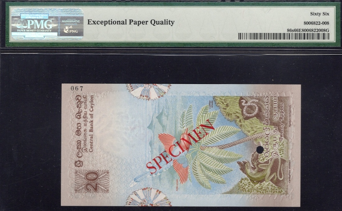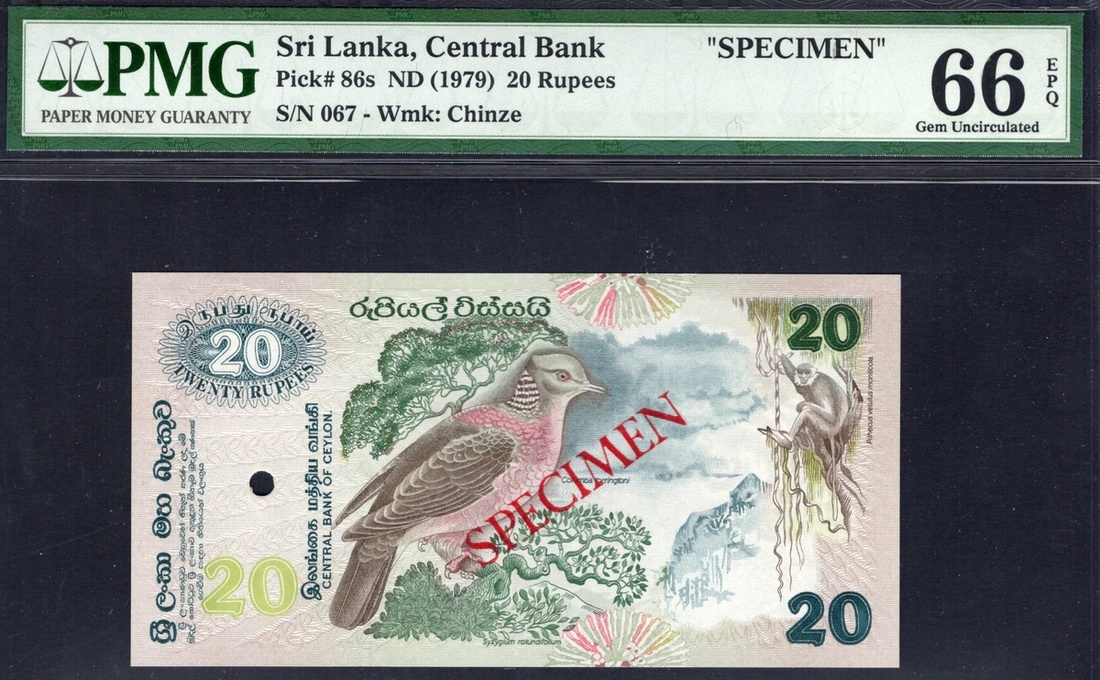 Sri Lanka. Central Bank of Ceylon. Specimen 20 Rupees. ND (1979). P-86s. No. 067. Brown and green on multicolor. Ceylon Wood Pigeon at center; Palm and lizard on vertical format back. Diagonal red SPECIMEN front and back, single punch. PMG Gem Uncirculated 66 EPQ.