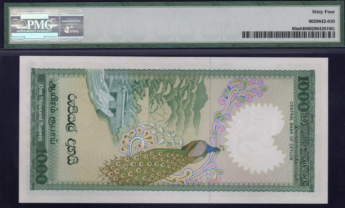Sri Lanka. Central Bank of Ceylon. 1000 Rupees. 1981. P-90a. No. P/5 755456. Green on multicolor. Wmk: lion with sword. Dam at right; Peacock, mountains and dam on vertical format back. PMG Choice Uncirculated 64.
