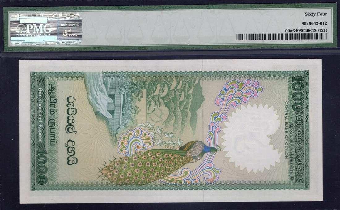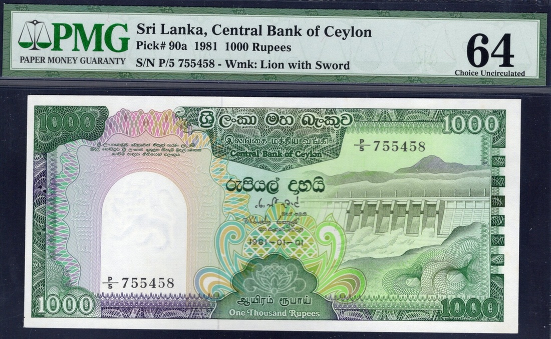 Sri Lanka. Central Bank of Ceylon. 1000 Rupees. 1981. P-90a. No. P/5 755458. Green on multicolor. Wmk: lion with sword. Dam at right; Peacock, mountains and dam on vertical format back. PMG Choice Uncirculated 64.