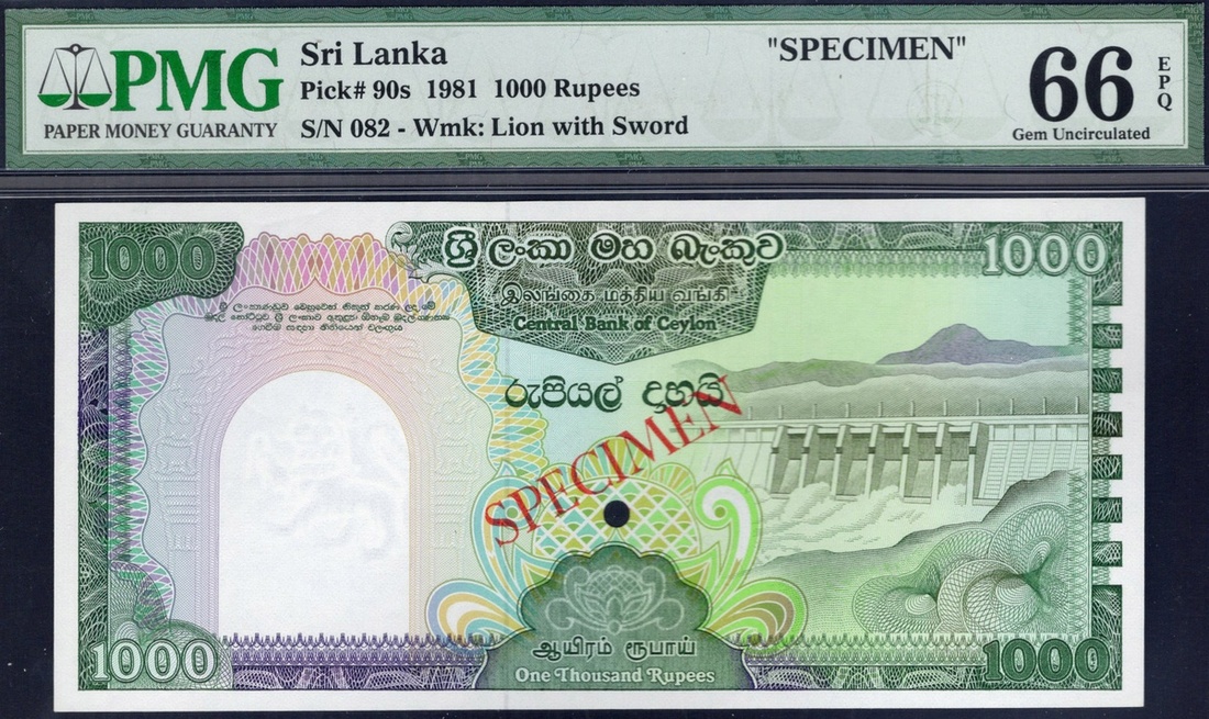 Sri Lanka. Central Bank of Ceylon. Specimen 1000 Rupees. 1981. P-90s. No. 082. Green on multicolor. Dam at right; Peacock, mountains and dam on vertical format back. Diagonal red SPECIMEN front and back, single punch. PMG Gem Uncirculated 66 EPQ.