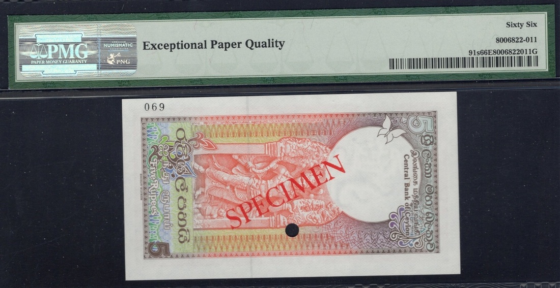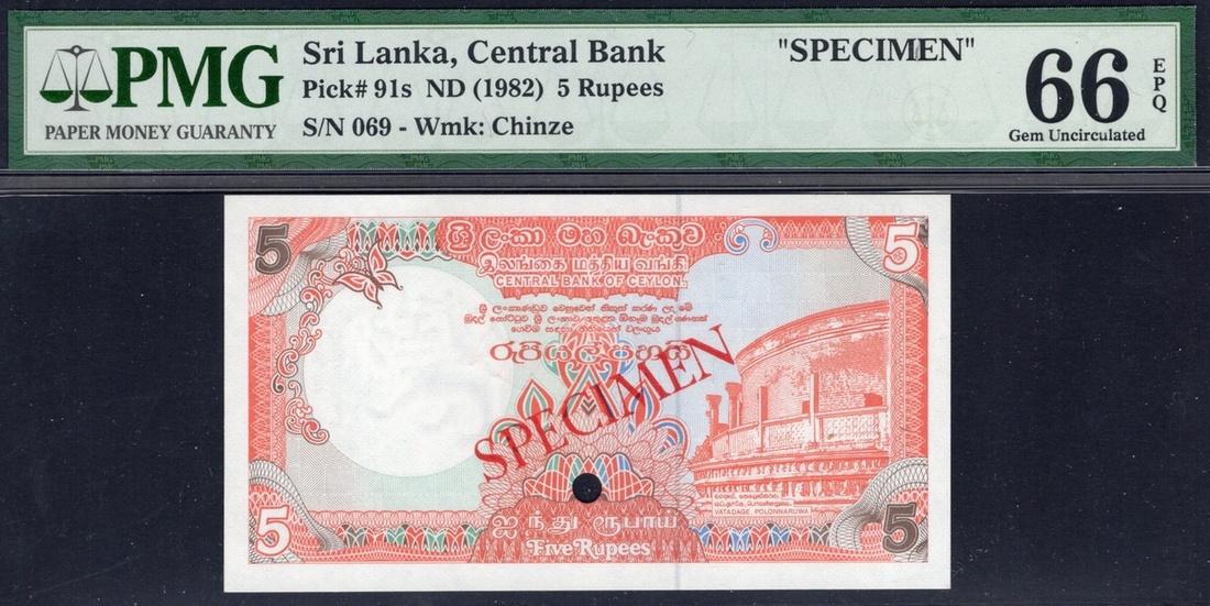 Sri Lanka. Central Bank of Ceylon. Specimen 5 Rupees. ND (1982). P-91s. No. 069. Light red on multicolor. Polonnaruwa Vatadage at right; Stone carving on vertical format back. PMG Gem Uncirculated 66 EPQ.