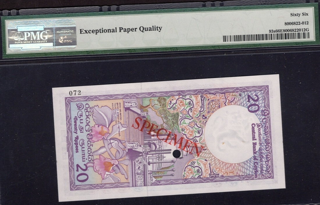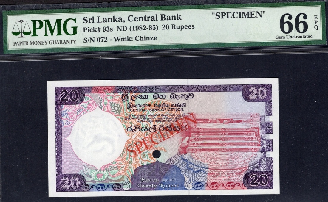 Sri Lanka. Central Bank of Ceylon. Specimen 20 Rupees. ND (1982). P-93s. No. 072. Purple on multicolor. Moonstone at right; Dagoba Shrine on vertical format back. PMG Gem Uncirculated 66 EPQ.