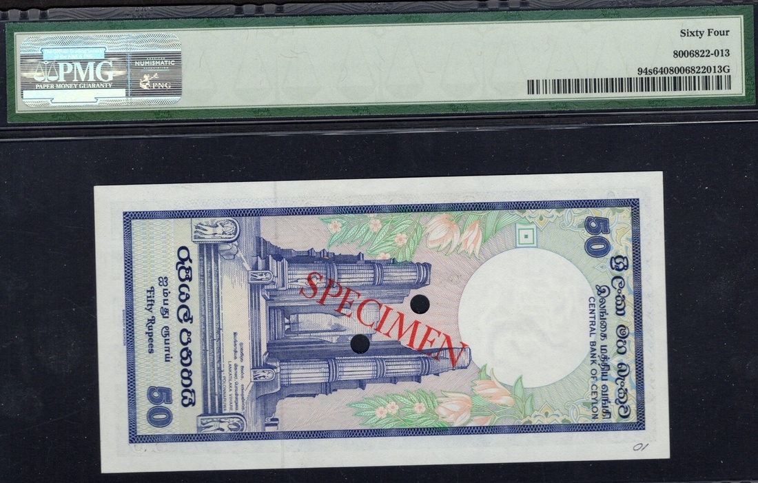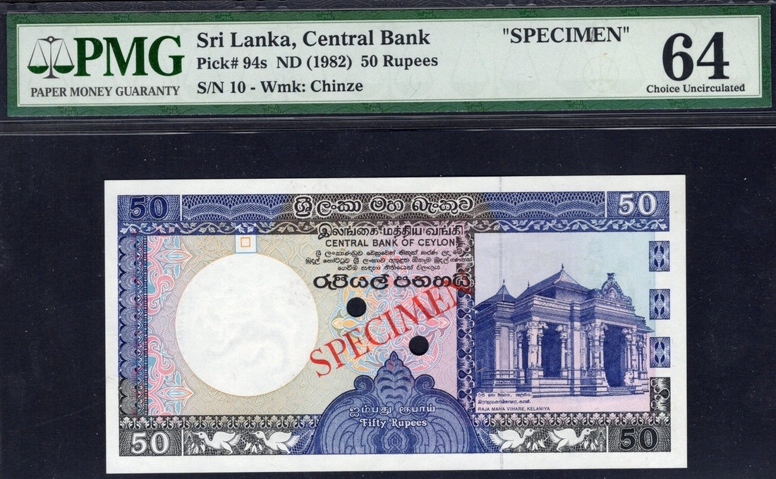 Sri Lanka. Central Bank of Ceylon. Specimen 50 Rupees. ND (1982). P-94s. No. 10. Dark and dark brown on multicolor. Kelaniya Temple at right; Polonnaruwa temple ruins on vertical format back. Diagonal red SPECIMEN front and back, two punches. PMG Choice Uncirculated 64.