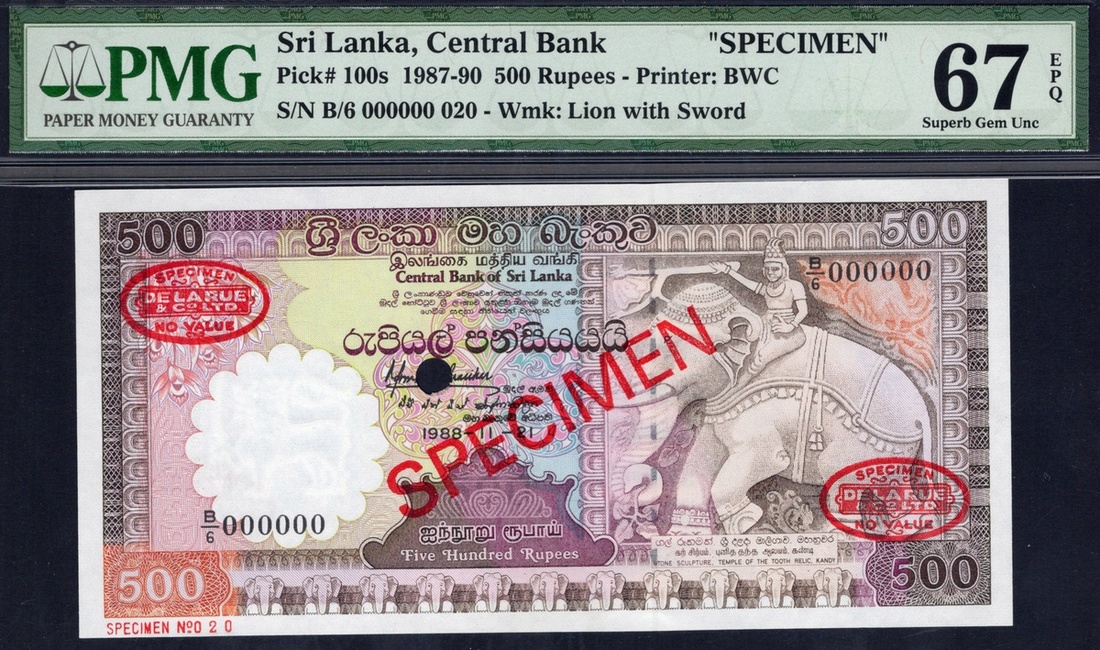 Sri Lanka. Central Bank of Sri Lanka. Specimen 500 Rupees. 1988. P-100s. No. B/6 000000 020. Brown and purple on multicolor. Classical-style elephant with rider at right; Abhayagiri Stupa, Anuradhapura temple on hill on vertical format back. Diagonal red SPECIMEN and two De la Rue stamps either side. PMG Superb Gem Unc 67 EPQ.