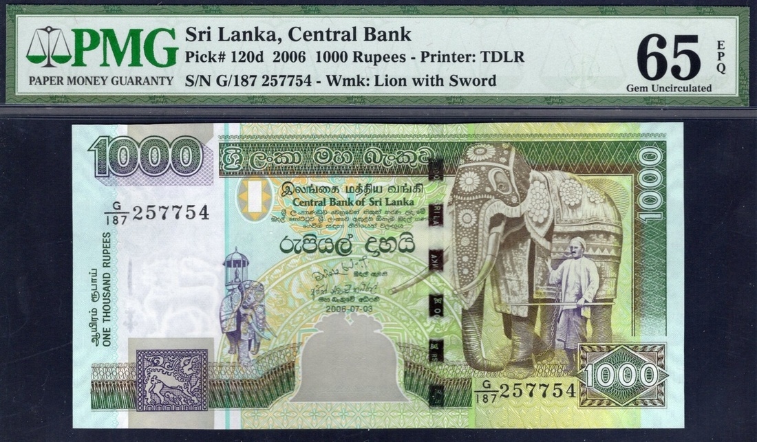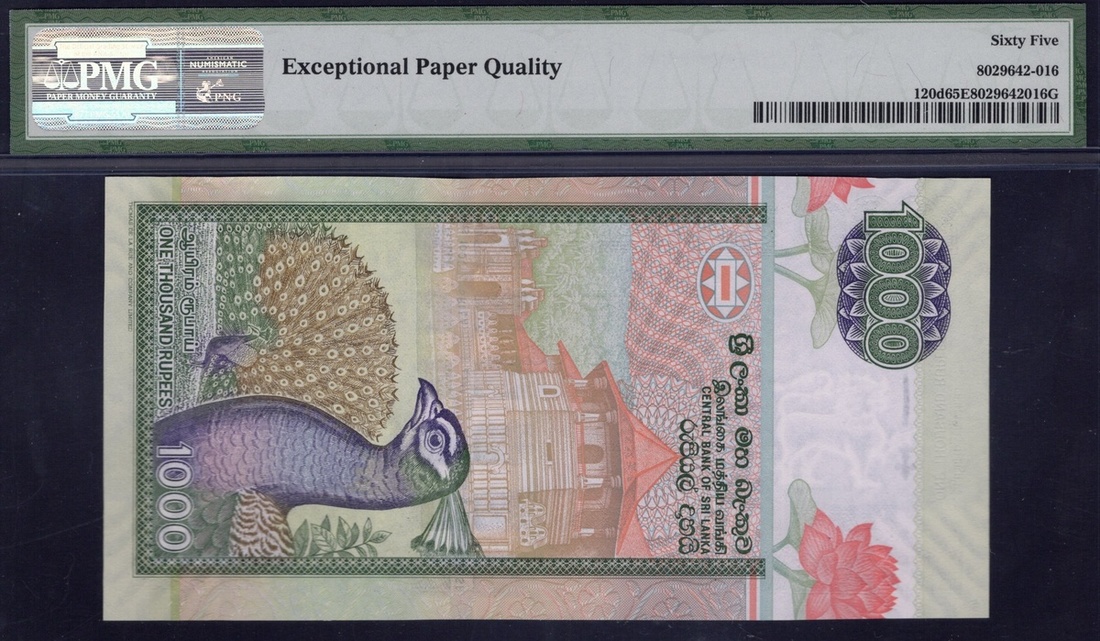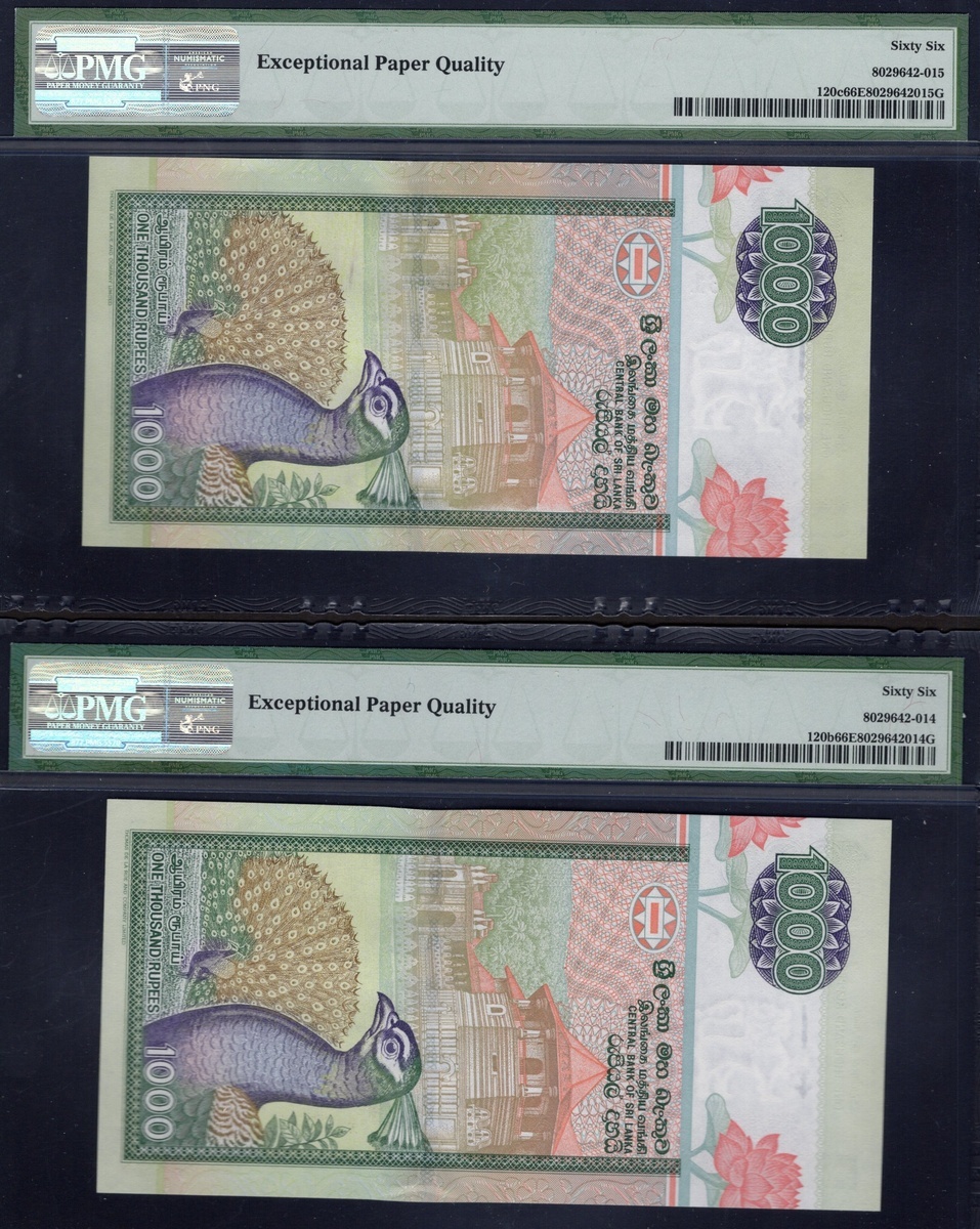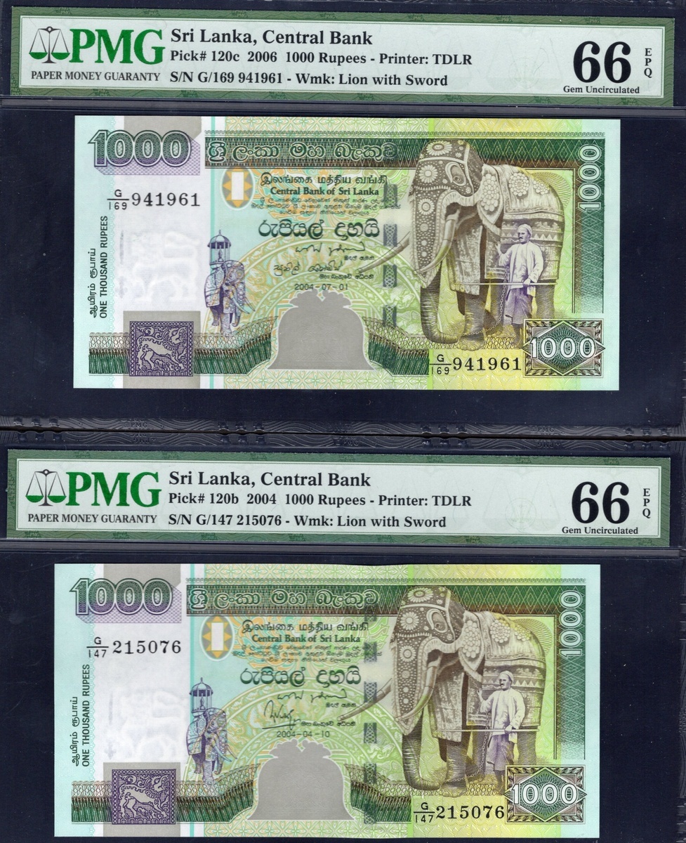 Sri Lanka. Central Bank of Sri Lanka. PMG-graded Variety Trio of 1000 Rupee notes. 2004, 2006. P-120b, c and d. Trainer standing with elephant at right, chinze lower left, caparisoned elephant left center; Peacock on palace lawn, lotus flowers, Octagon Temple of the Tooth on vertical format back. The first two Gem Uncirculated 66 EPQ, the latter Gem Uncirculated 65 EPQ. [3]