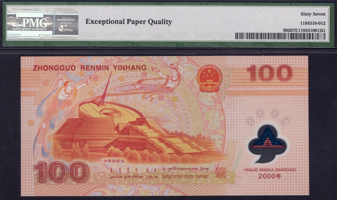 China. Peoples Republic. Commemorative 100 Yuan. 2000. P-902b. No. J00823375. Polymer. Dragon at center, OVD upper right; Millenium Monument on back. PMG Superb Gem 67 EPQ.