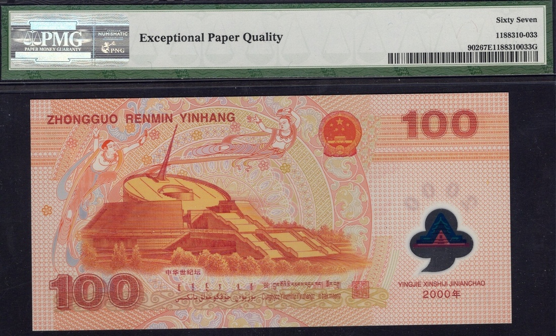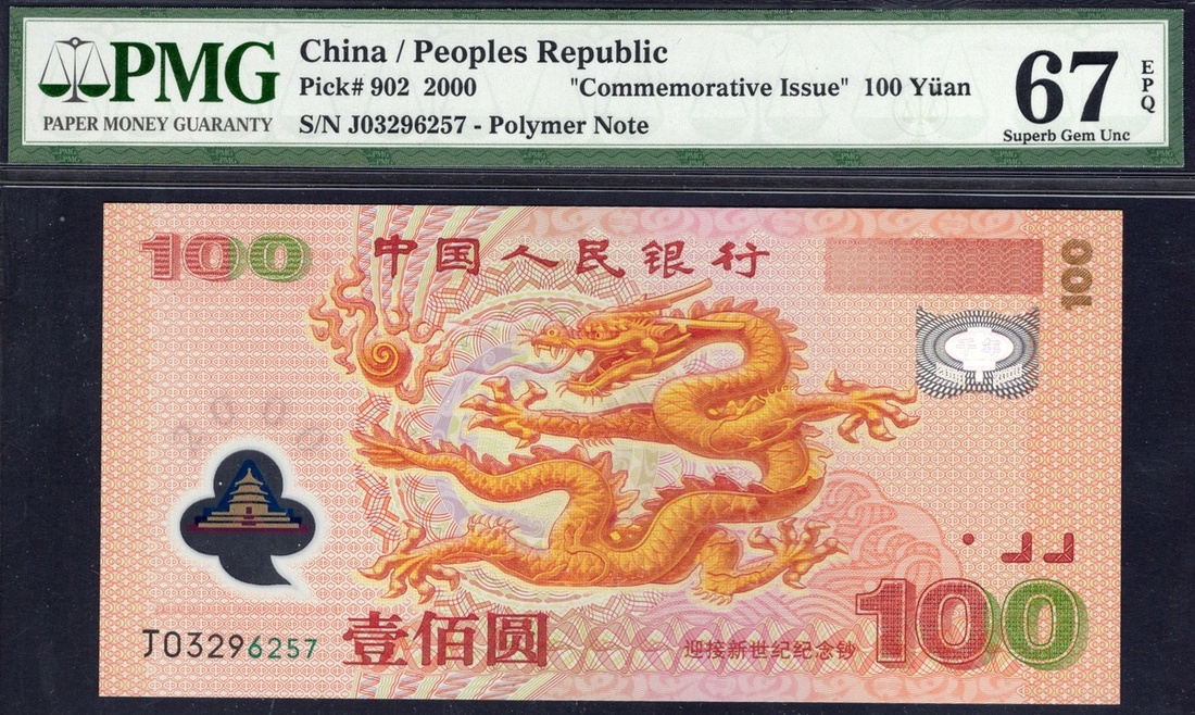 China. Peoples Republic. Commemorative 100 Yuan. 2000. P-902b. No. J03296257. Polymer. Dragon at center, OVD upper right; Millenium Monument on back. PMG Superb Gem 67 EPQ.