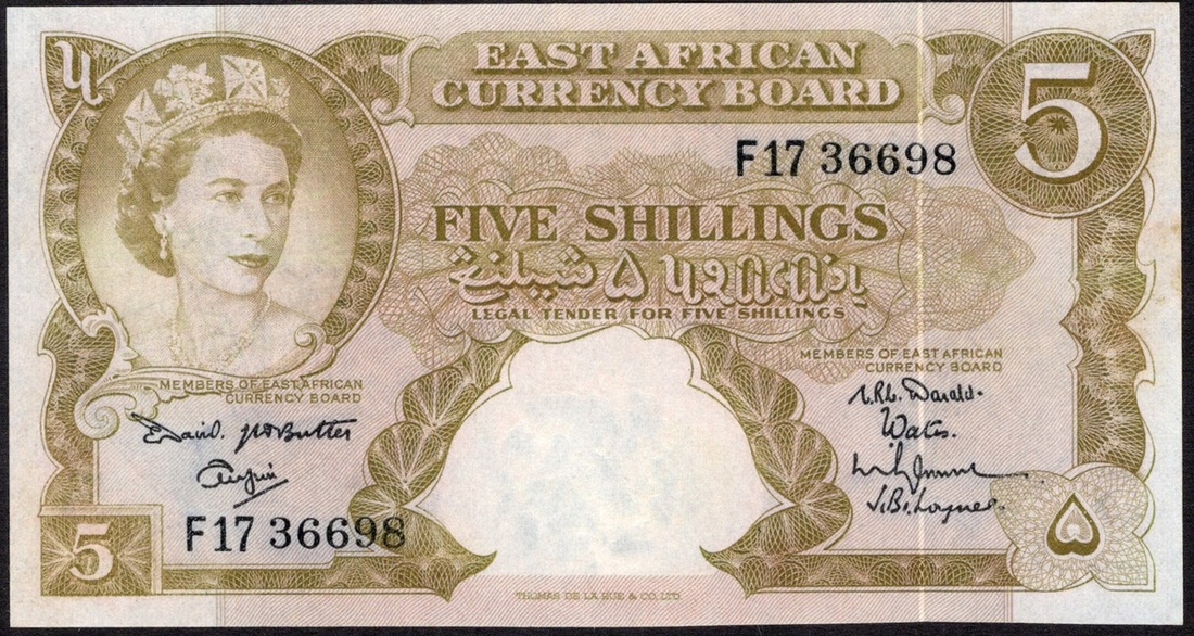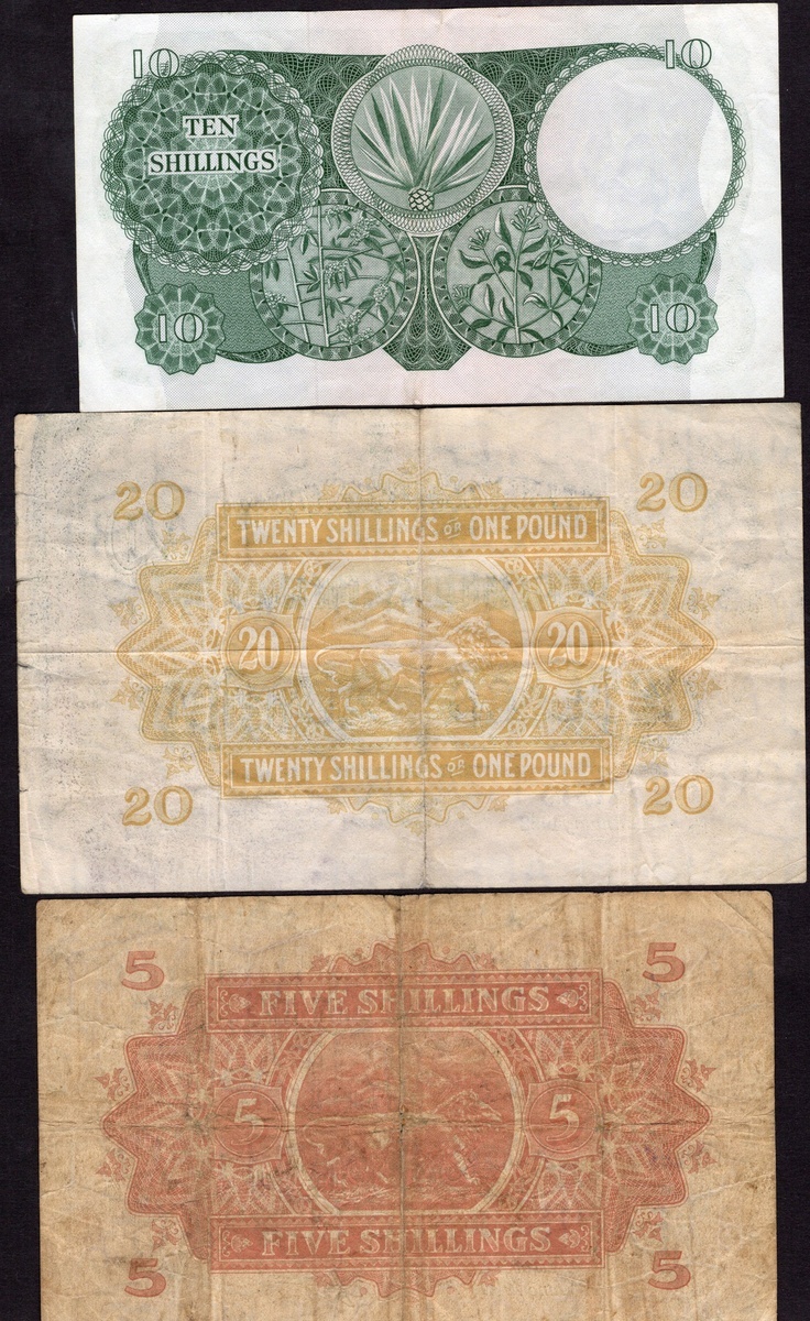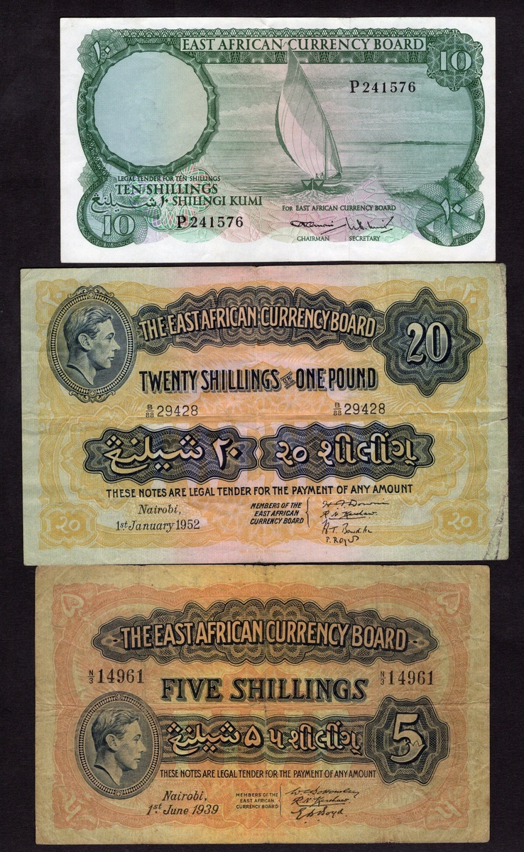 East African lot, 1939-1964. East African Currency Board. 5 Shillings. 1st June 1939. P-26Aa. Very Good; 20 Shillings. 1st January 1952. P-30b. Very Good, small tear at edge. George VI at left; 5 Shillings. ND (1961). P-41a. Elizabeth II at left. PVC damage, EF details; 10 Shillings. ND (1964). P-46a. Sailboat. Very Fine. [4]