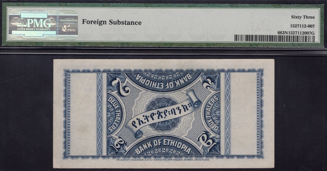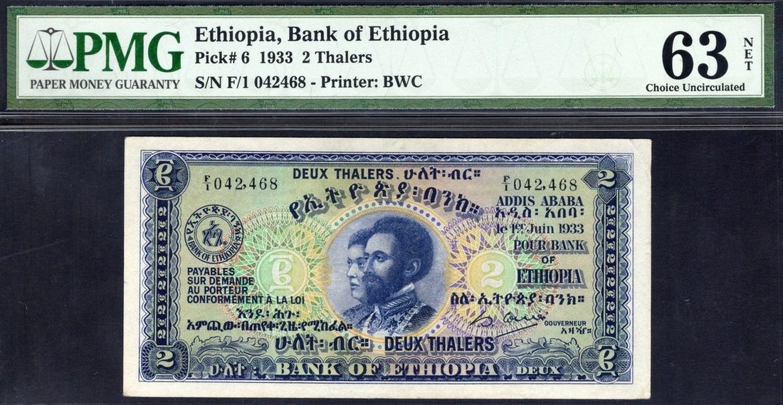 Ethiopia. Bank of Ethiopia. 2 Thalers. 1933. P-6. No. F/1 042468. Dark blue on green and multicolor. Emperor Haile Selassie and Empress Menen Asfaw at center. PMG Choice Uncirculated Net 63, foreign substance (not readily discernible).