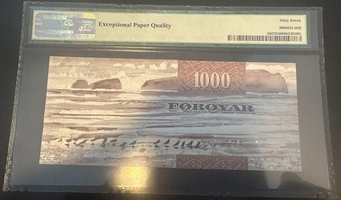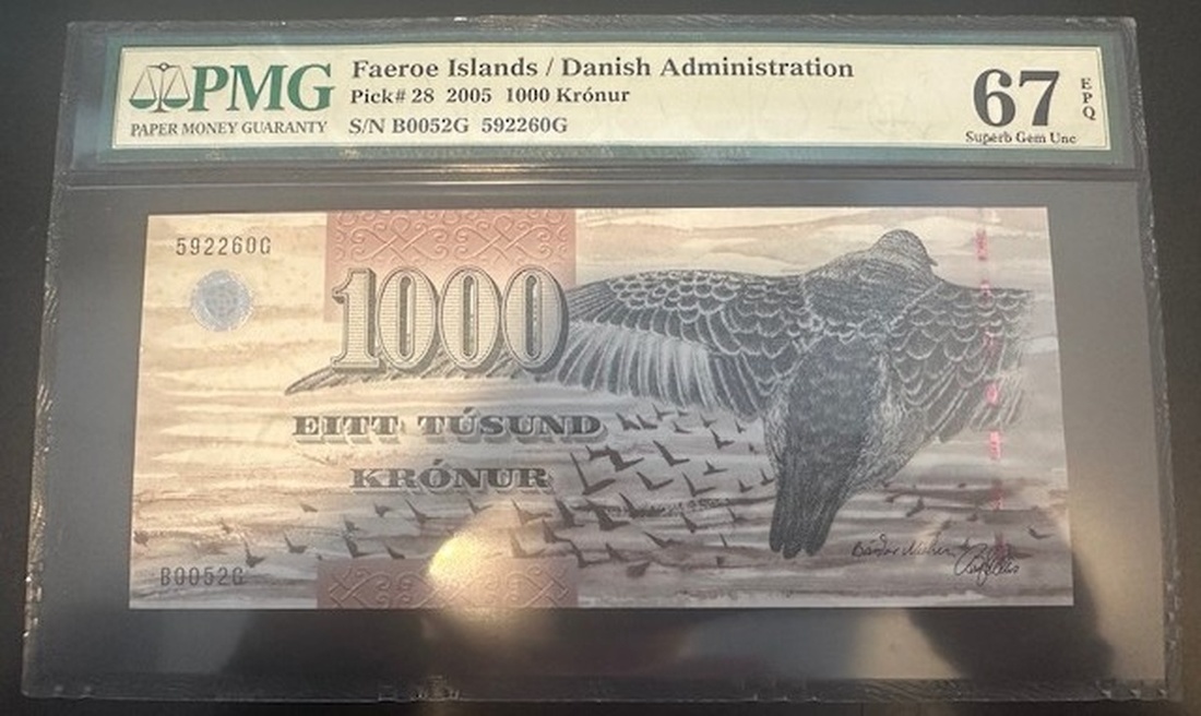Faeroe Islands. Danish Administration. 1000 Krónur. 2005. P-28. No. B0052G 592260G. Black and dull red. Black-gray Sandpiper in flight; View from the Island of Sandoy on back. PMG Superb Gem Unc 67 EPQ.
