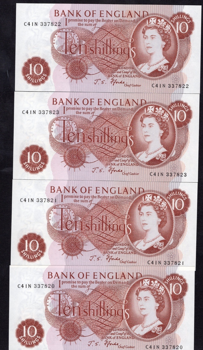 Great Britain. Bank of England. Consecutive run of 10 Shilling notes. ND (1966-1970). P-373c. Nos. C4IN 337820 to 337829. Signed: J.S. Fforde. Brown on multicolor. Elizabeth II at right. Crisp Uncirculated. [10]