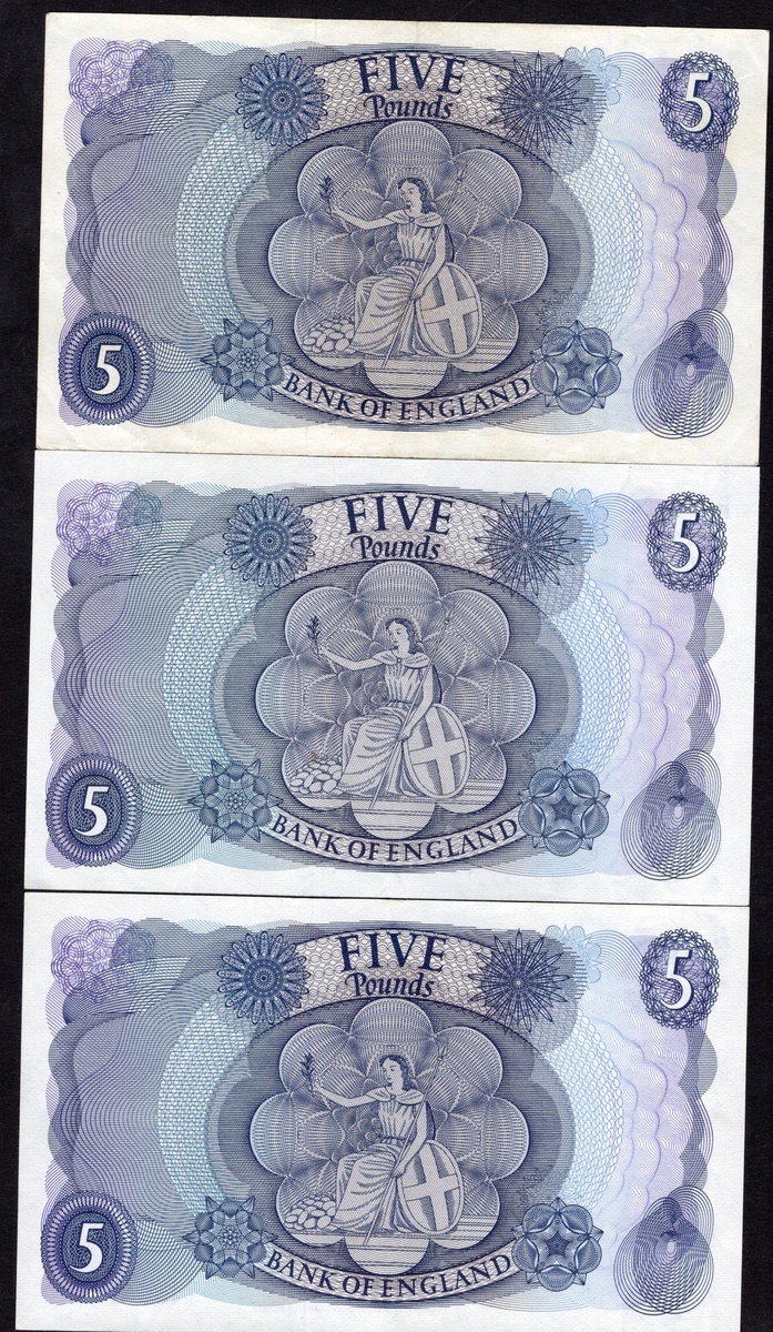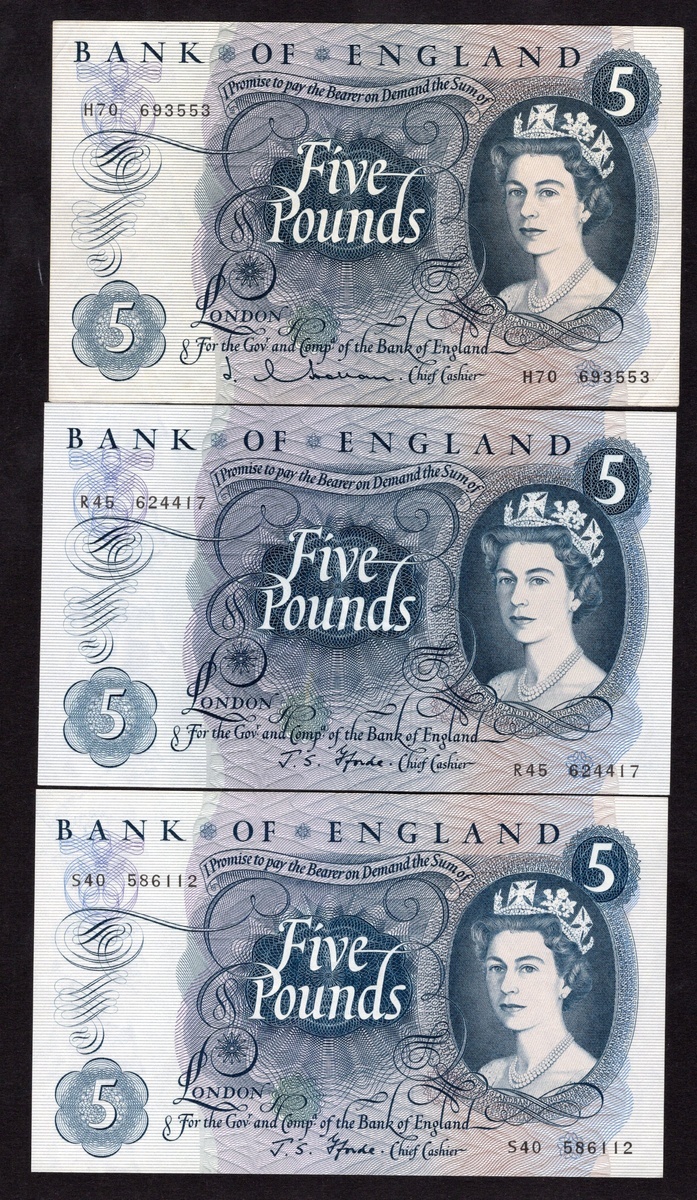 Great Britain. Bank of England. Trio of 5 Pound notes. ND (1963-66; 1966-70). P-375a, b (2). Signed: J.Q. Hollom, J.S. Fforde. Deep blue on multicolor. Elizabeth II at right. The first VF, the others Crisp Uncirculated. [3]