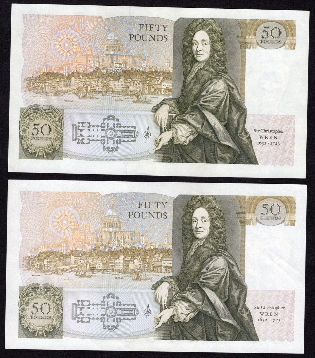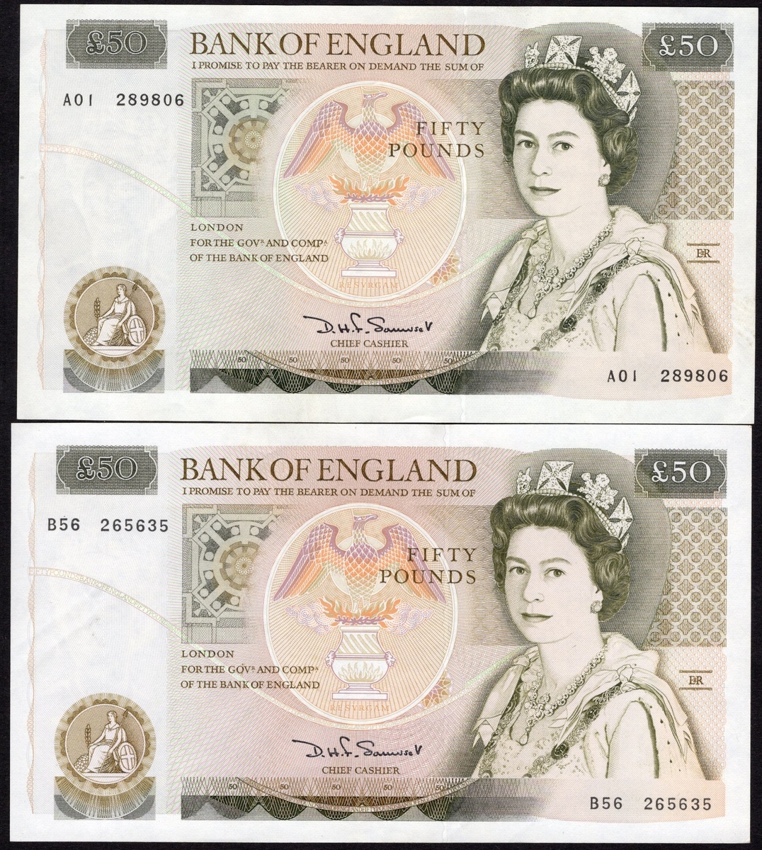 Great Britain. Bank of England. Pair of 50 Pound notes. ND (1981-1988). P-381a. No. A01 289806 and B56 265635. Olive-green and brown on multicolor. Signed: D.H.F. Somerset. Berobed Elizabeth II at right; Sir Wren and view and plan of St. Paul's Cathedral on back. Crisp AU with light teller handling one cornertip. The second, handling marks at back right, AU. [2]