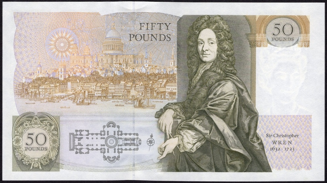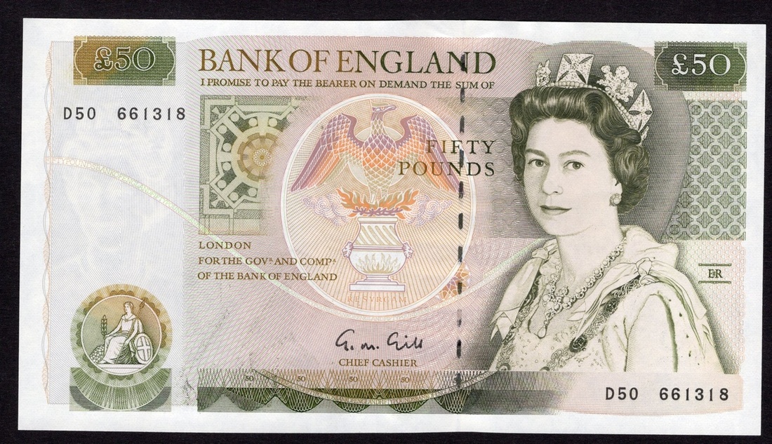 Great Britain. Bank of England. 50 Pounds. ND (1988-1991). P-381b. No. D50 661318. Olive-green and brown on multicolor. Signed G.M. Gill. Berobed Elizabeth II at right; Sir Wren and view and plan of St. Paul's Cathedral on back. EF-AU, pressmark upper margin.