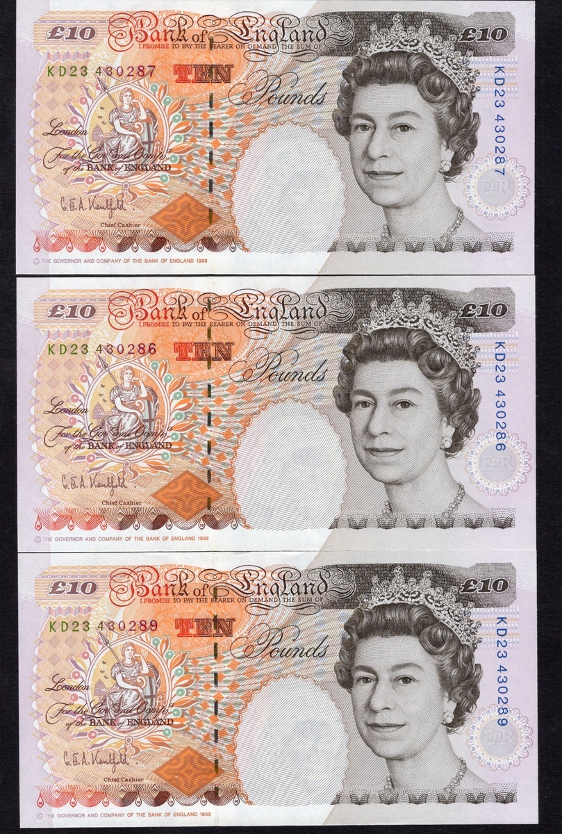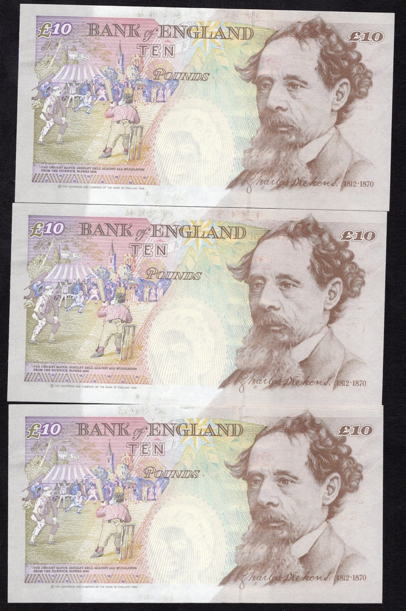 Great Britain. Bank of England. Group of 1993-199810 Pound notes. P-386a. Signed G.E.A. Kentfield. Elizabeth II at right; Charles Dickens and cricket match on back. AU-Uncirculated. [11]