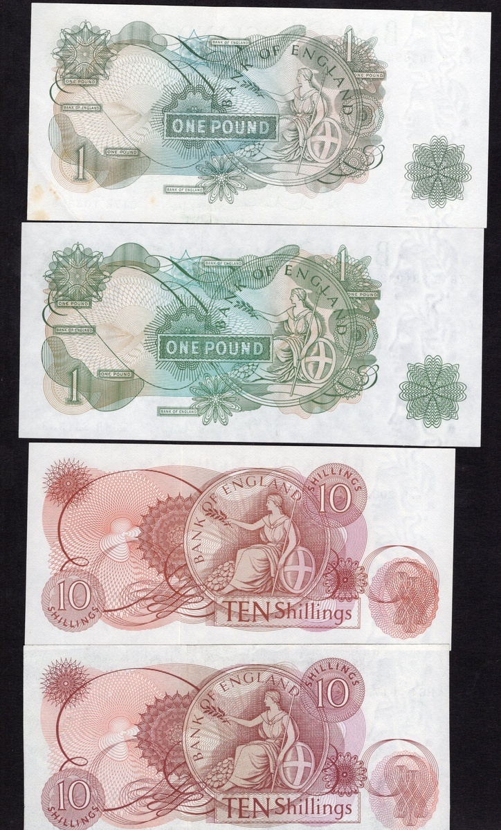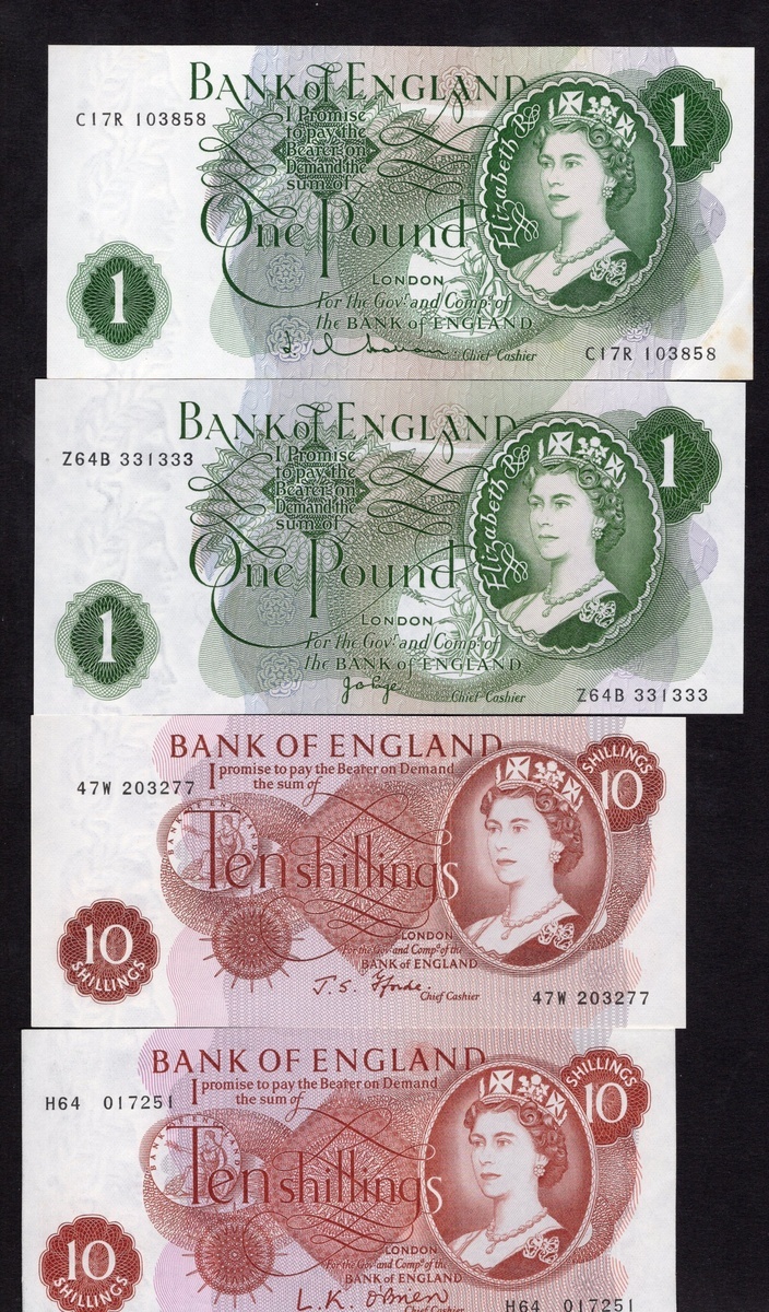 Great Britain. Bank of England. Lot of 1961-1977 issue 10 Shilling and 1 Pound notes. 10 Shillings. P-373a, c (9). Signed: L.K. O'Brien, J.S. Fforde. The latter consecutive group of 3, 5 and single; 1 Pound. P-374c (8), g. The first consecutive group of 3 and 5. A few of Pounds with some spotting. AU-Uncirculated. [19]