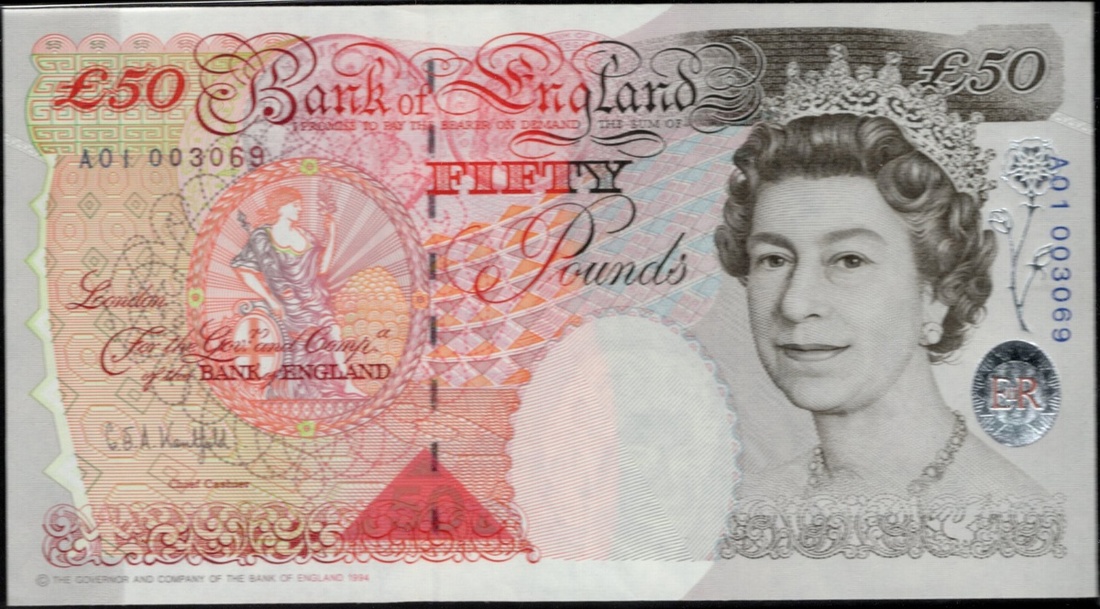 Great Britain. Bank of England - Royal Mint 1994 Commemorative Set. 50 Pounds. 1994. P-388a. No A01 003069. Elizabeth II at right; Bank gatekeeper back left, Sir J. Houblon at right. Crisp Uncirculated; and Silver Proof 50 Pence, 1994. Allied invasion. Choice Brilliant Proof. With CoA in red case of issue.