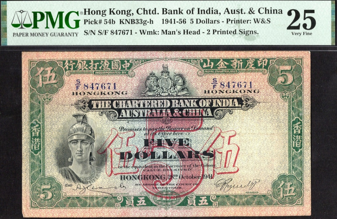 Hong Kong. Chartered Bank of India, Australia & China. 5 Dollars. 28th October 1941. P-54b.No. S/F 847671. Black, green and red. Helmeted warrior's bust lower left. PMG Very Fine 25, previously mounted.