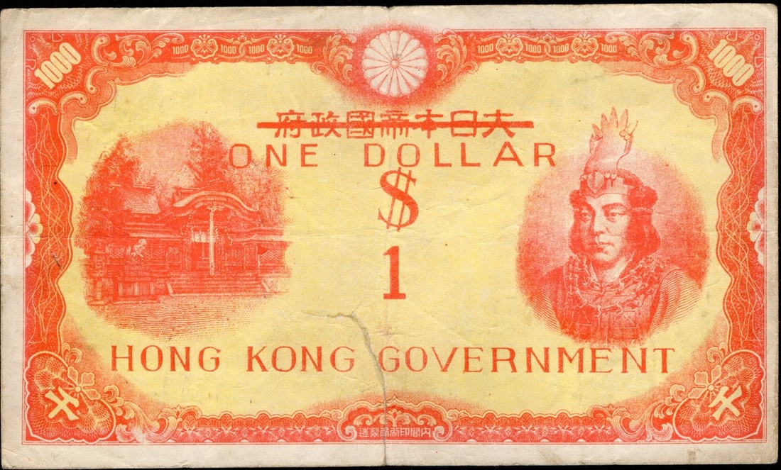 Hong Kong. Government of Hong Kong. 1945 Emergency Issue. British Military Administration. 1 Dollar. P-318. Red overprint on 1000 Yen. Tape repair on back for hooked tear. About VF details.