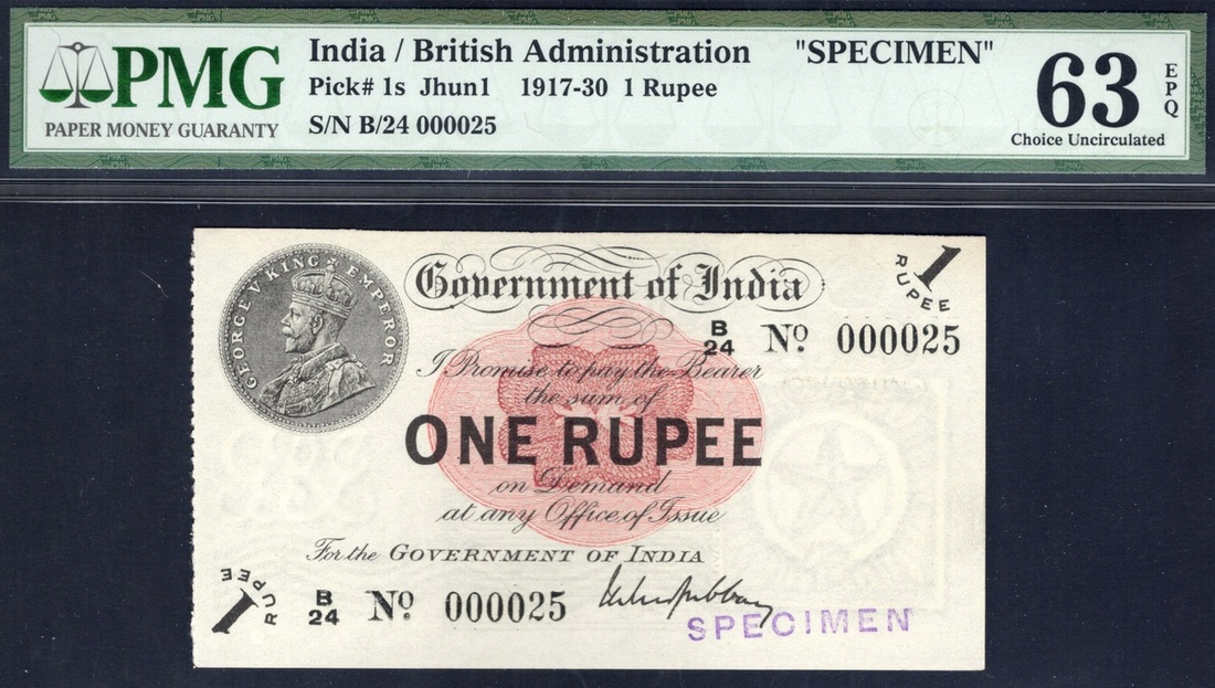 India. British Administration. Government of India. Specimen 1 Rupee. 1917. P-1s, Jhun 1. No. B/24 000025. Black, red underprint. Obverse and reverse of a 1917 Rupee coin. Horizontal "Specimen" in purple lower front. Very rare. PMG Choice Uncirculated 63 EPQ. A similar Specimen note graded by PMG Choice Unc 64 EPQ realized $16,800 (including BP) in the Heritage June 18, 2024 auction, lot 24283.