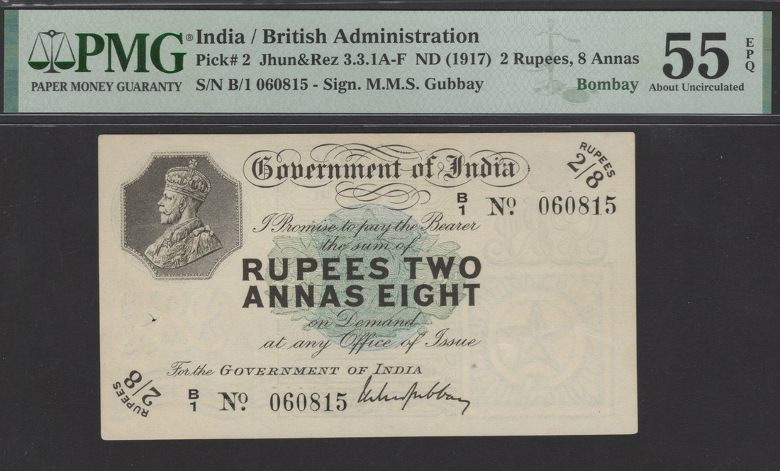 India. British Administration. Government of India. 2 Rupees 8 Annas. ND (1917). P-2, J&R 3.3.1A-F. No. B/1 060815. Black on green. George V portrait in octagon upper left; Eight language panels on back. PMG About Uncirculated 55 EPQ, spindle hole at issue. Rare.