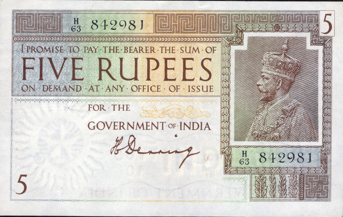 India. British Administration. Government of India. 5 Rupees. ND, 1917-1930 issue. P-4a. No. H/63 842981. Brown-violet, green and light brown. Signed: H. Denning. Spindle hole at left, Very Fine.
