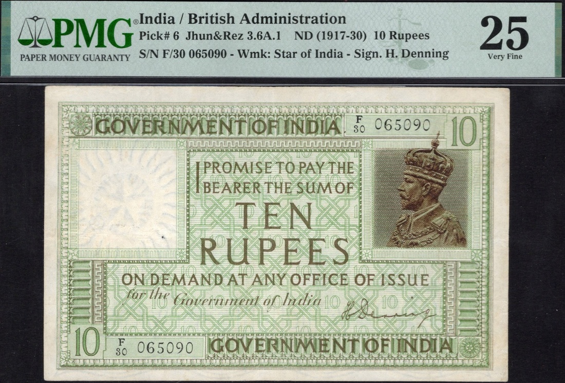 India. British Administration. Government of India. 10 Rupees. ND (1917-1930). P-6, J&R 3.6A.1. No. F/30 065090. Signed: H. Denning. Green and brown. George V upper right. PMG Very Fine 25.