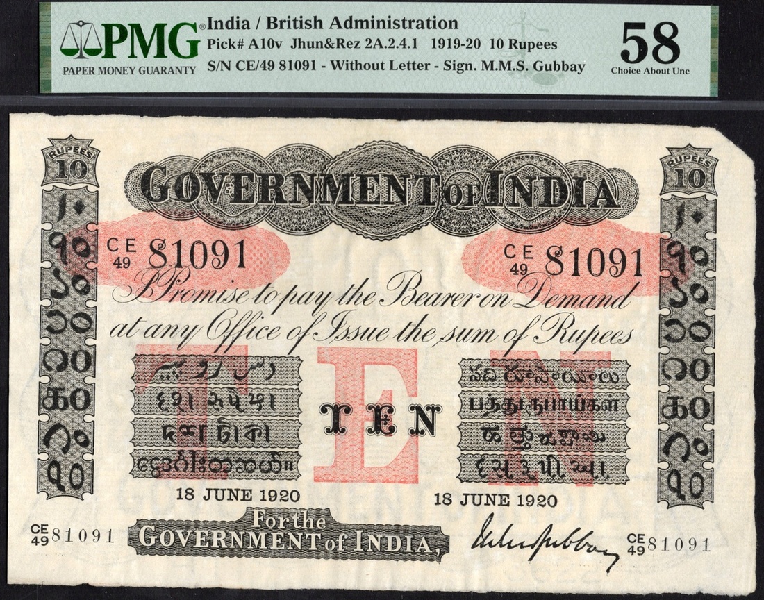India. British Administration. Government of India. 10 Rupees. 19 June 1920. P-A10v, J&R 2A.2.4.1. No. CE/49 81091. Signed: M.M.S. Gubbay. Black on light red. PMG 58 Choice About Unc.